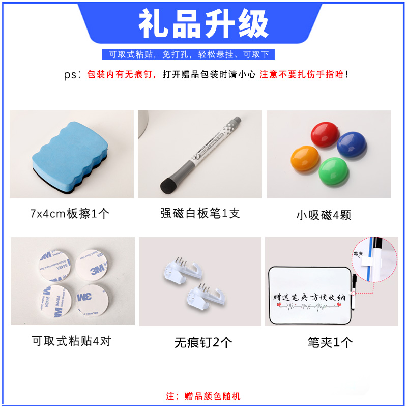 Pink soft edge Wooden frame bracket Board eraser 1 Strong magnetic whiteboard pen 1 Pen clip 1 Paste 4 pairs of magnetic buckles 4 Blue soft edge Wooden frame bracket Board eraser 1 Strong magnetic whiteboard pen 1 Pen clip 1 Paste 4 pairs of magnetic buckles 4