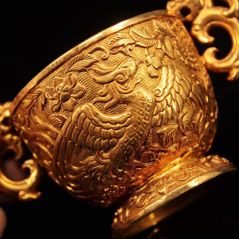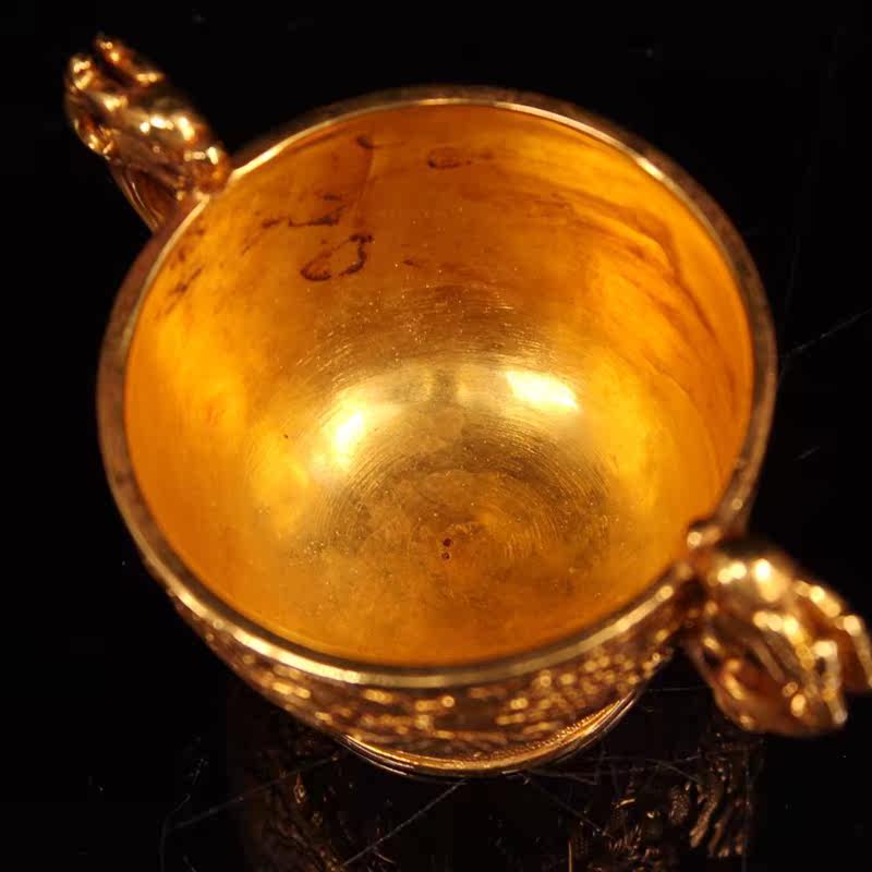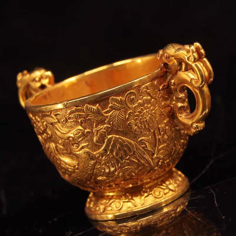 Antique antique collection pure copper gilt double Phoenix double ear glass cup tea cup Home Office tea table decoration gift