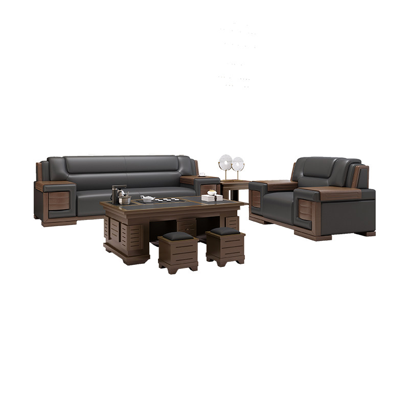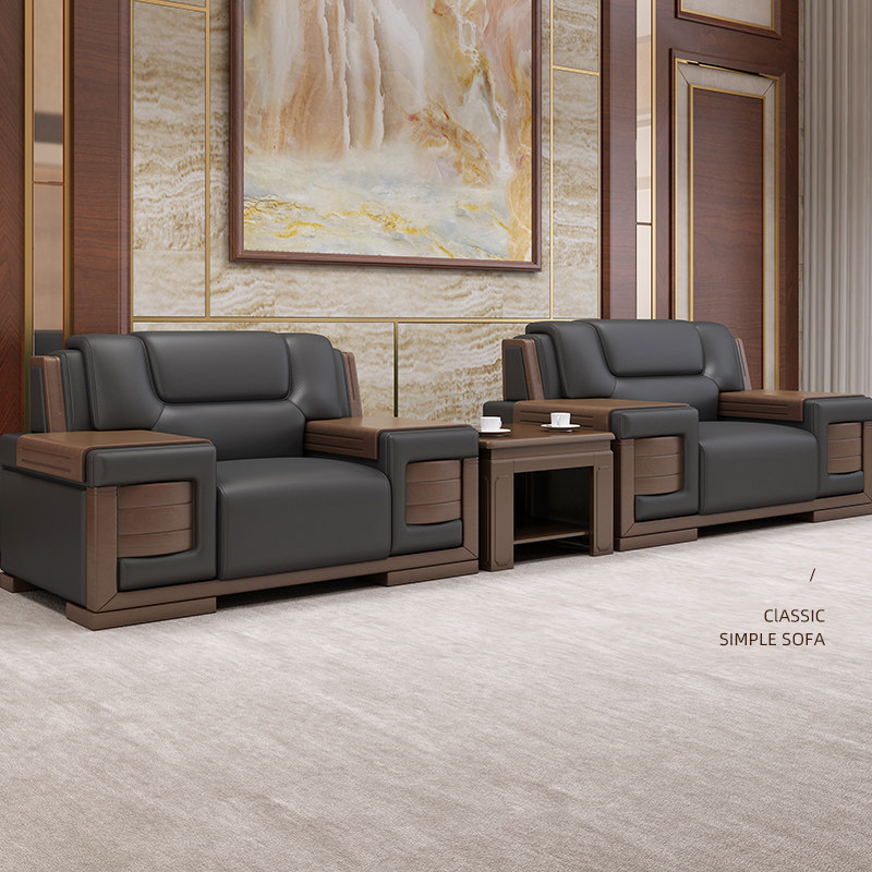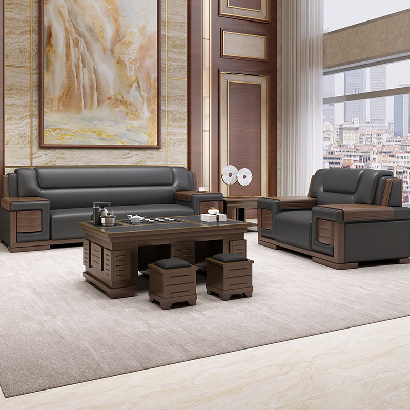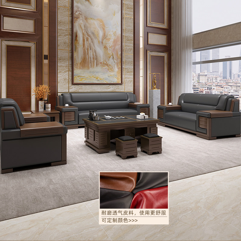 Office sofa business reception boss office modern Chinese high-end atmospheric leather three-person solid wood combination