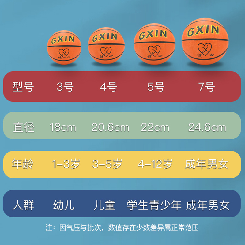 No. 7 basketball (standard ball) No. 5 basketball (for teenagers) No. 3 basketball (for children's games) No. 4 basketball (for young children)