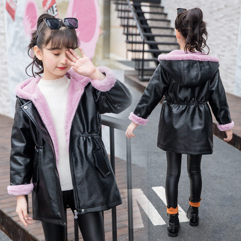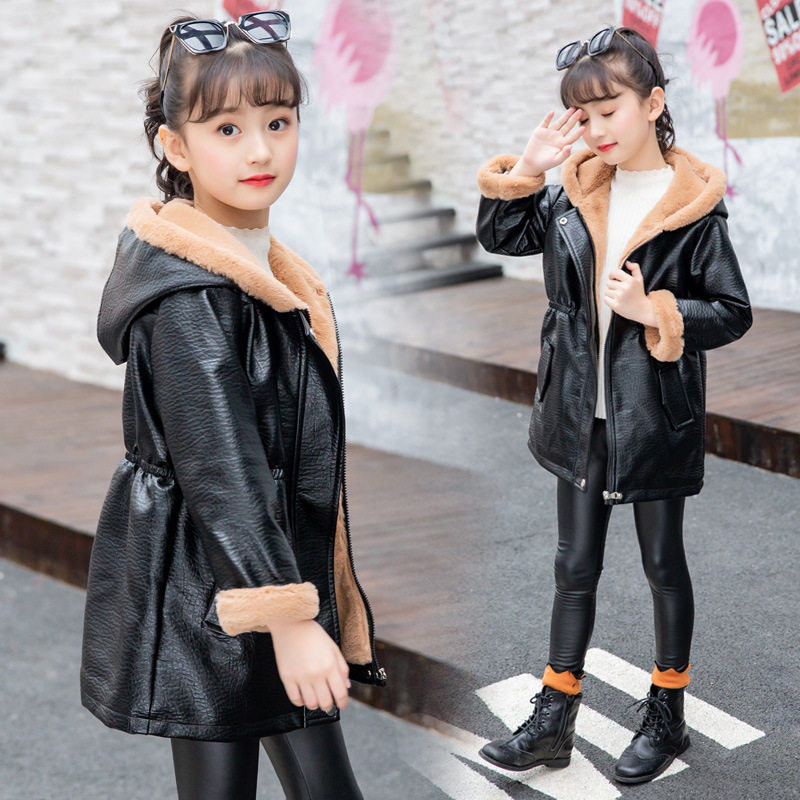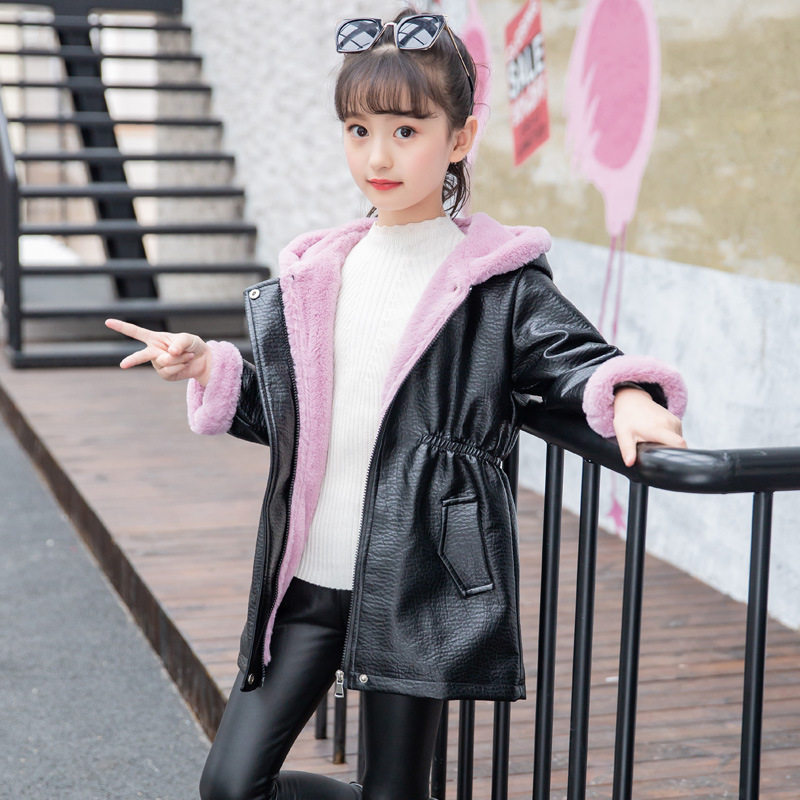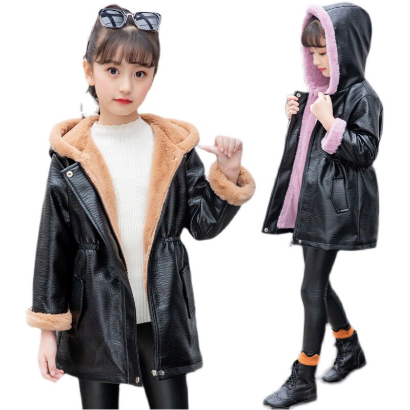 Girl's medium long version of leather clothes Winter new Korean version Fashion CUHK Thickened Wind Clothing Plus Suede Warm Mesh Infrared