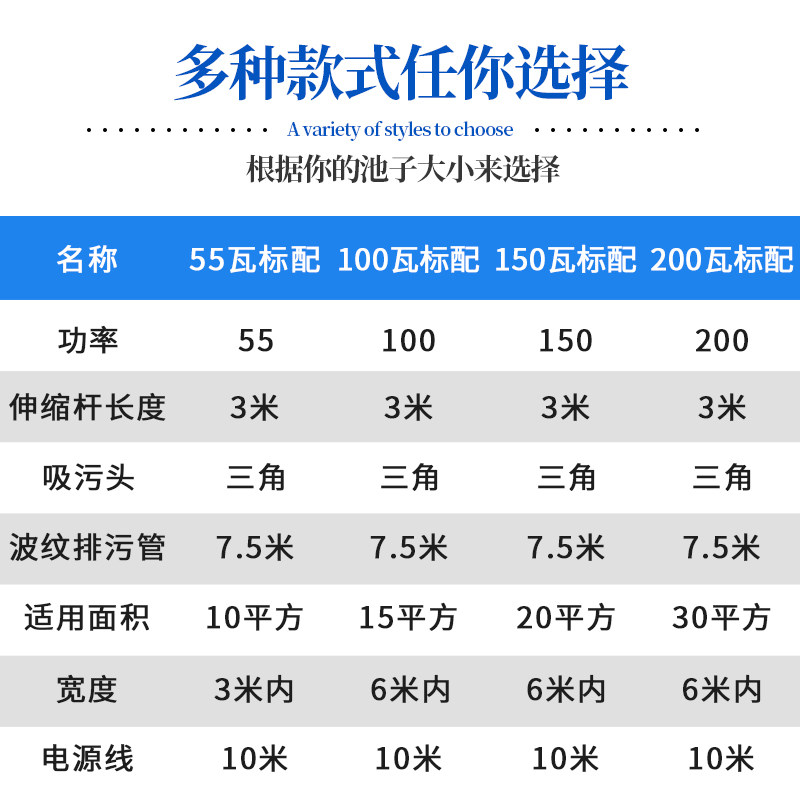 55 W package 155 W package 2 filter bag shallow water net 100 W package 1 (10 m power cord 100 W package 2 (10 m power cord pool brush 150 W package 1 (10)