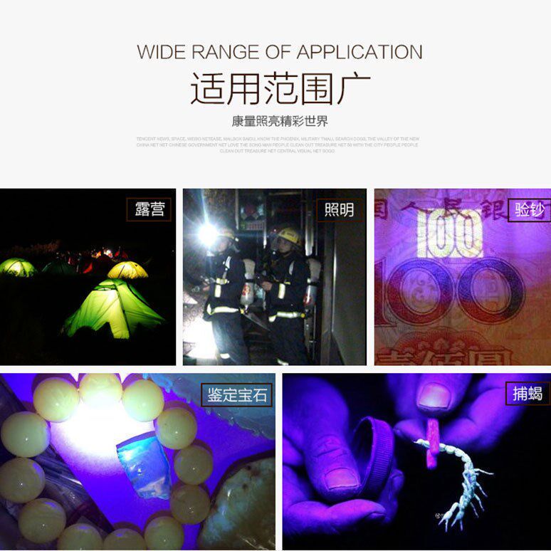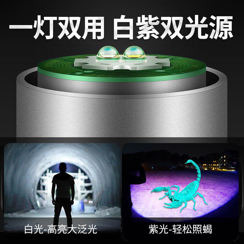 Dual light source charging white light T6 purple light 395UV flashlight to catch scorpion ultraviolet curing money detection jade detection
