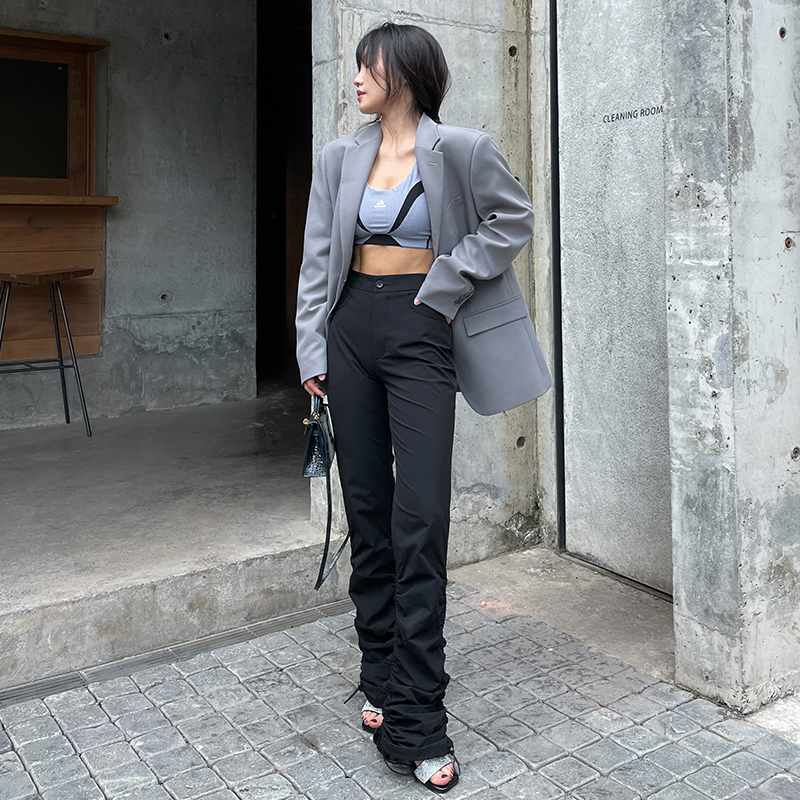 LEIYU High Waist Pumping Pleats Casual Pants Woman Autumn 2021 New Elastic Body and American Ins Micro LaLong pants design sensation