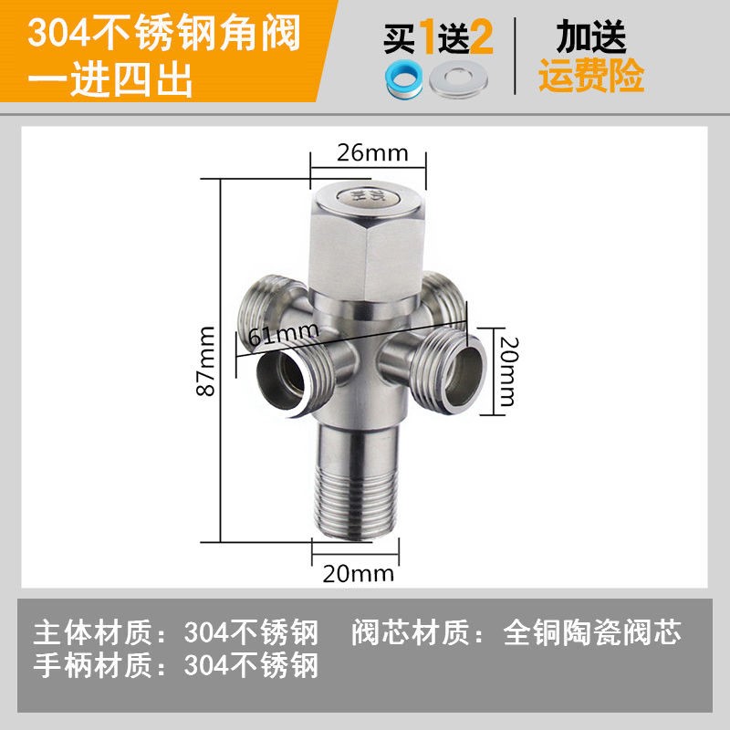 Triangle valve all copper hot and cold water 4-point valve switch household 304 stainless steel three-way one-in-two-out stop water valve