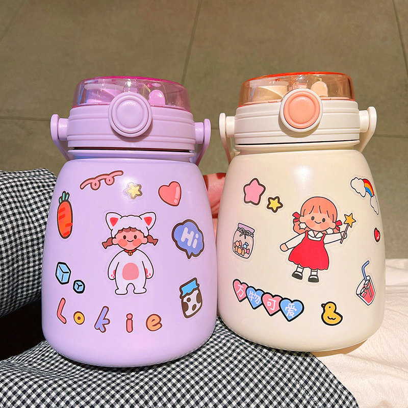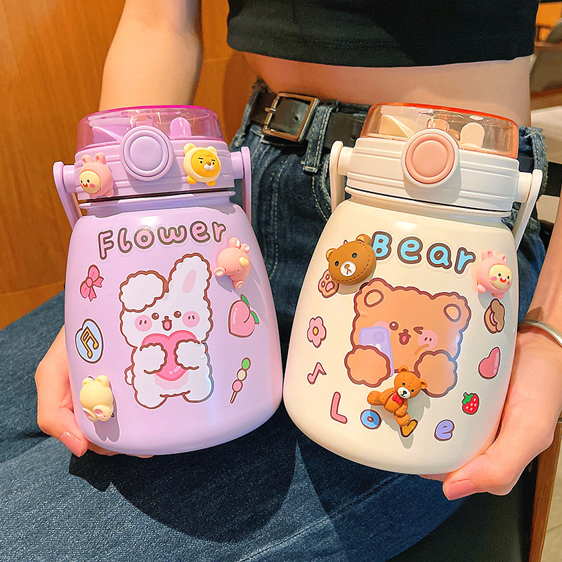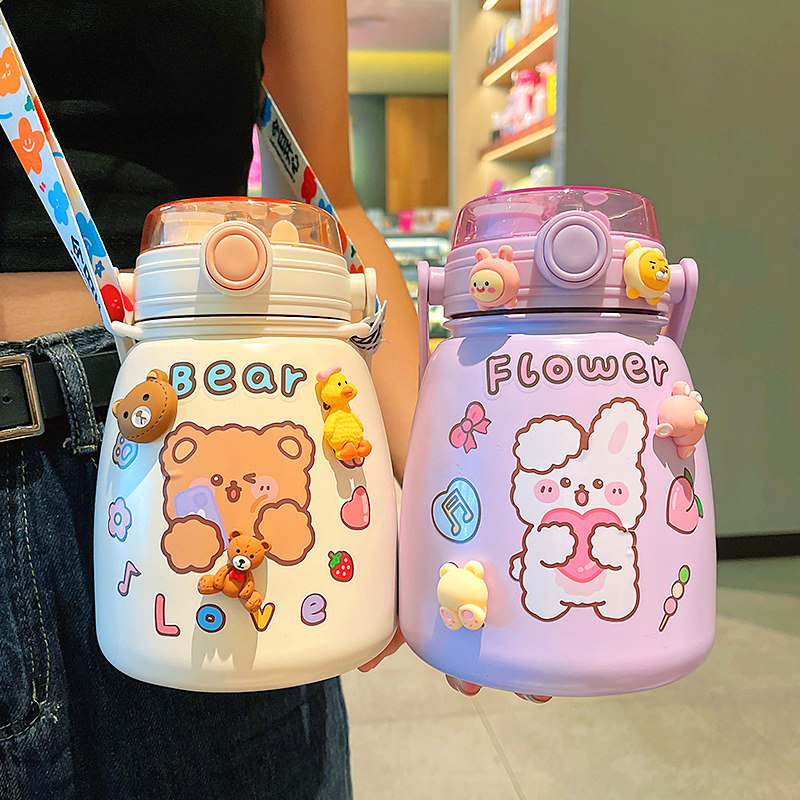 Double-drink mug ladies high-value cup with messenger straw water cup children's cute student portable water bottle