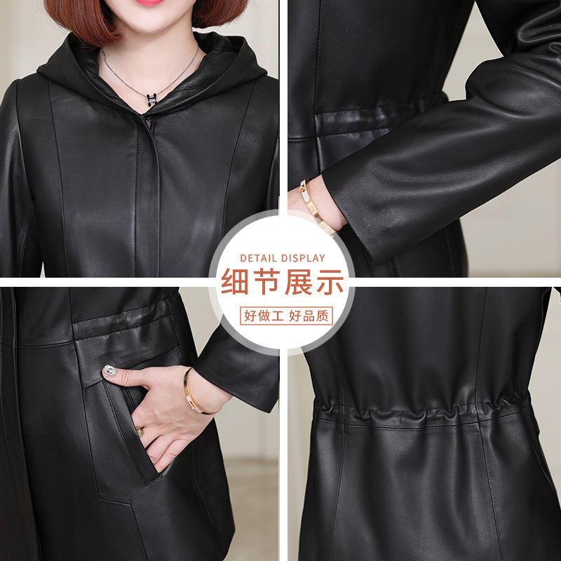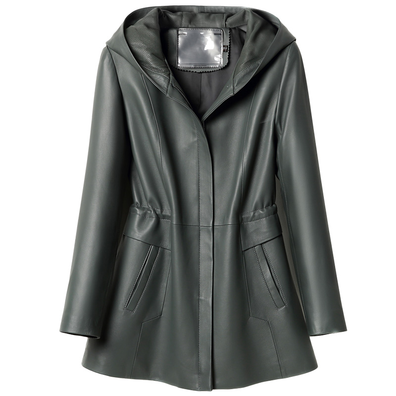 Henning genuine leather clothing female medium long version with cap laced with waist small sub-wind clothes drawn rope sheep leather jacket jacket