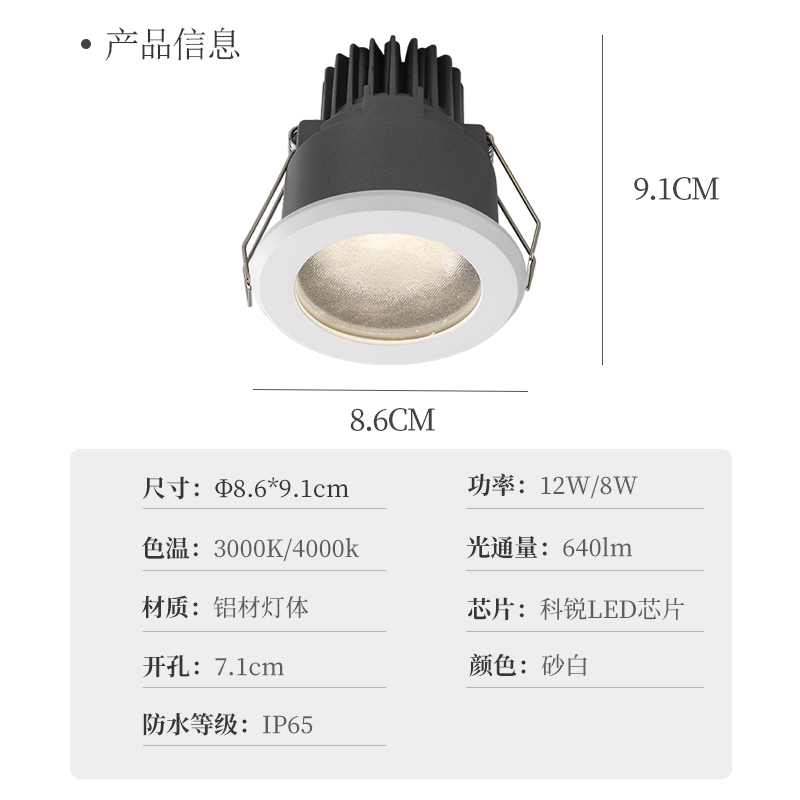 led kitchen and bathroom spotlight built-in toilet shower room shower room 12W waterproof fog glare IP65 ceiling downlight