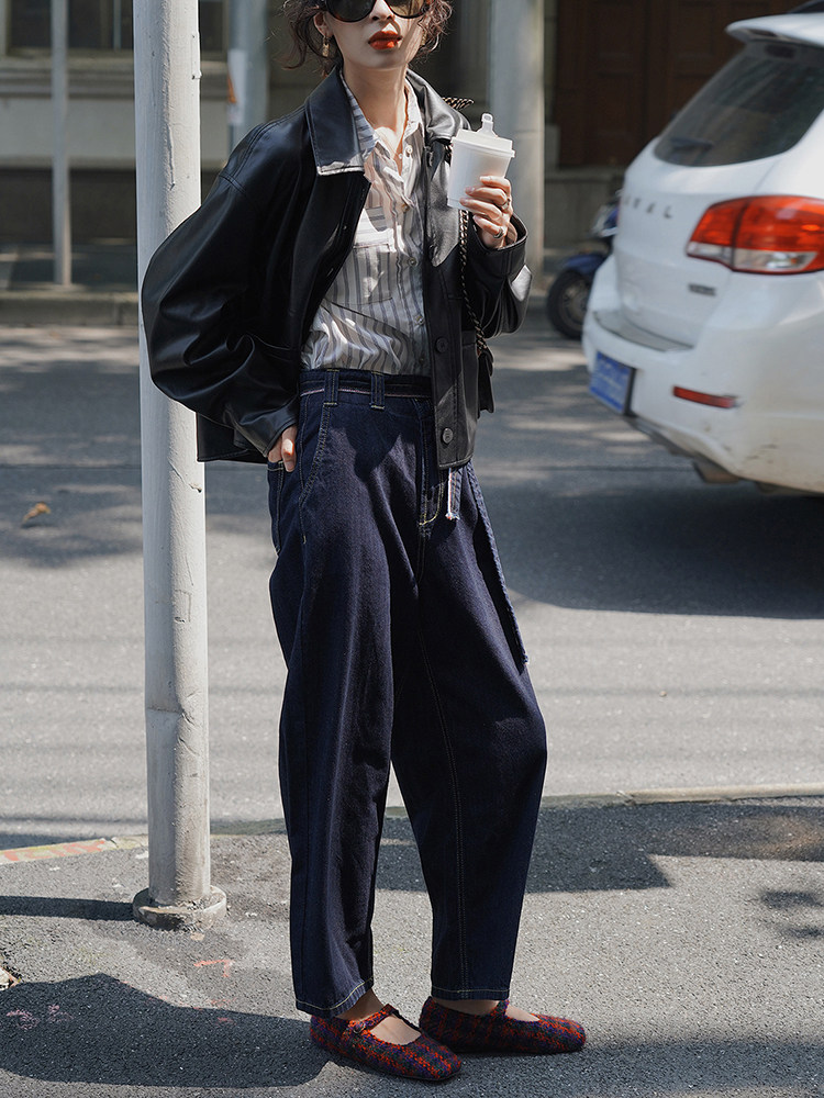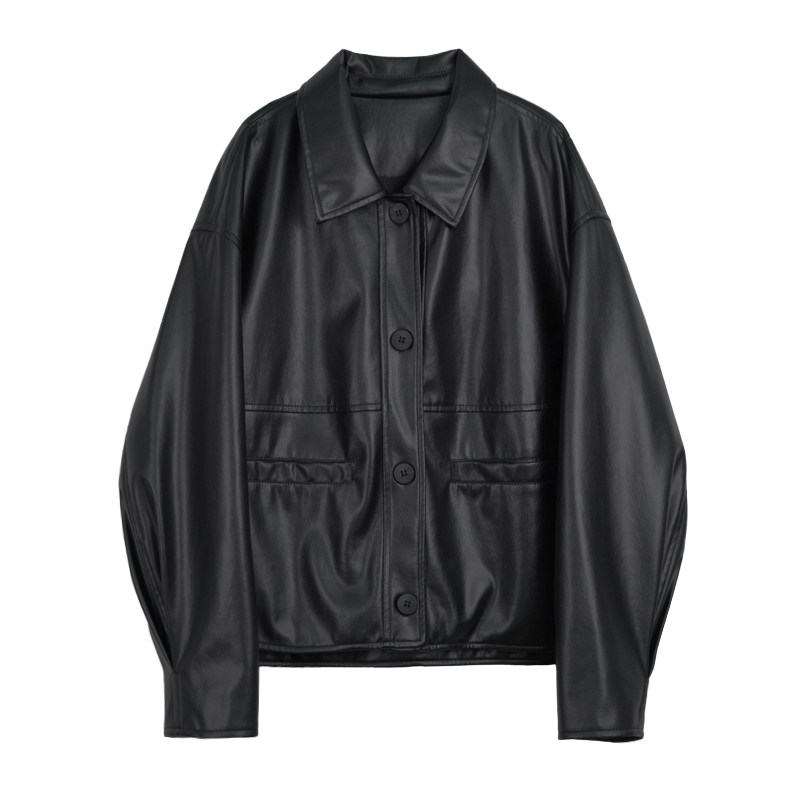 White Description Workroom Black Leather Woman's new American retro - simulated sheepskin loose short jacket coat