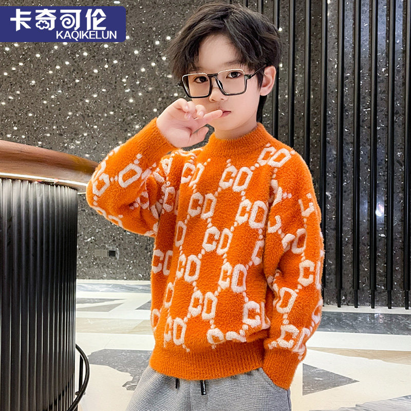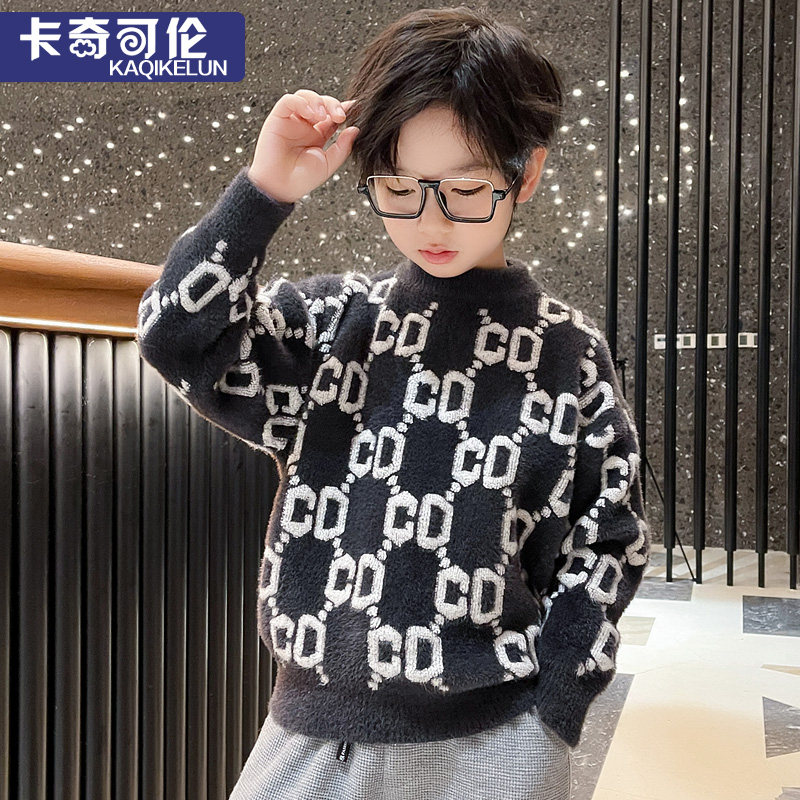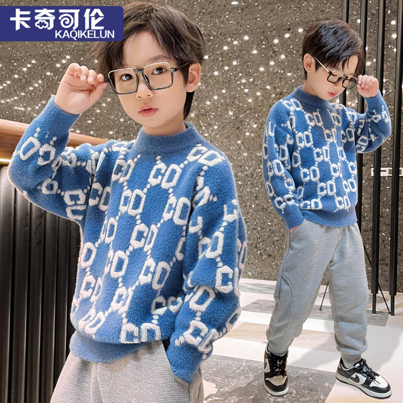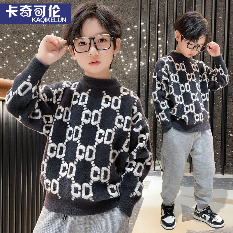 Boys' sweater autumn and winter style 2022 new children's knitted sweater winter plus velvet thickened medium and big boys mink velvet