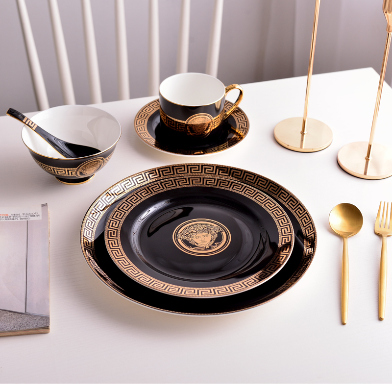 ten-inch flat pan 8-inch flat pan 8-inch soup pan 12-inch fish pan 4 5-inch bowl spoon chopstick one double knife fork spoon gold foil coffee cup straight body coffee cup