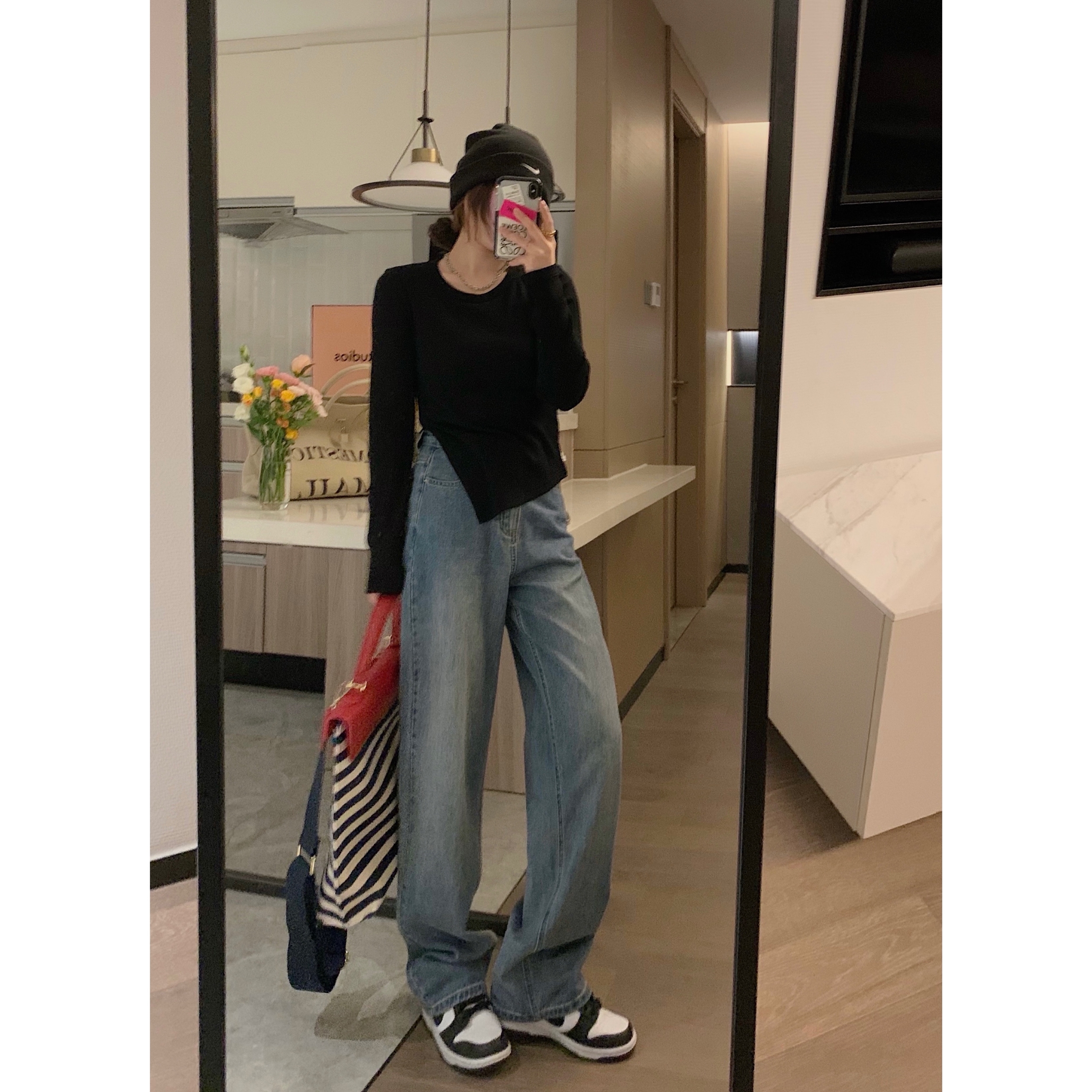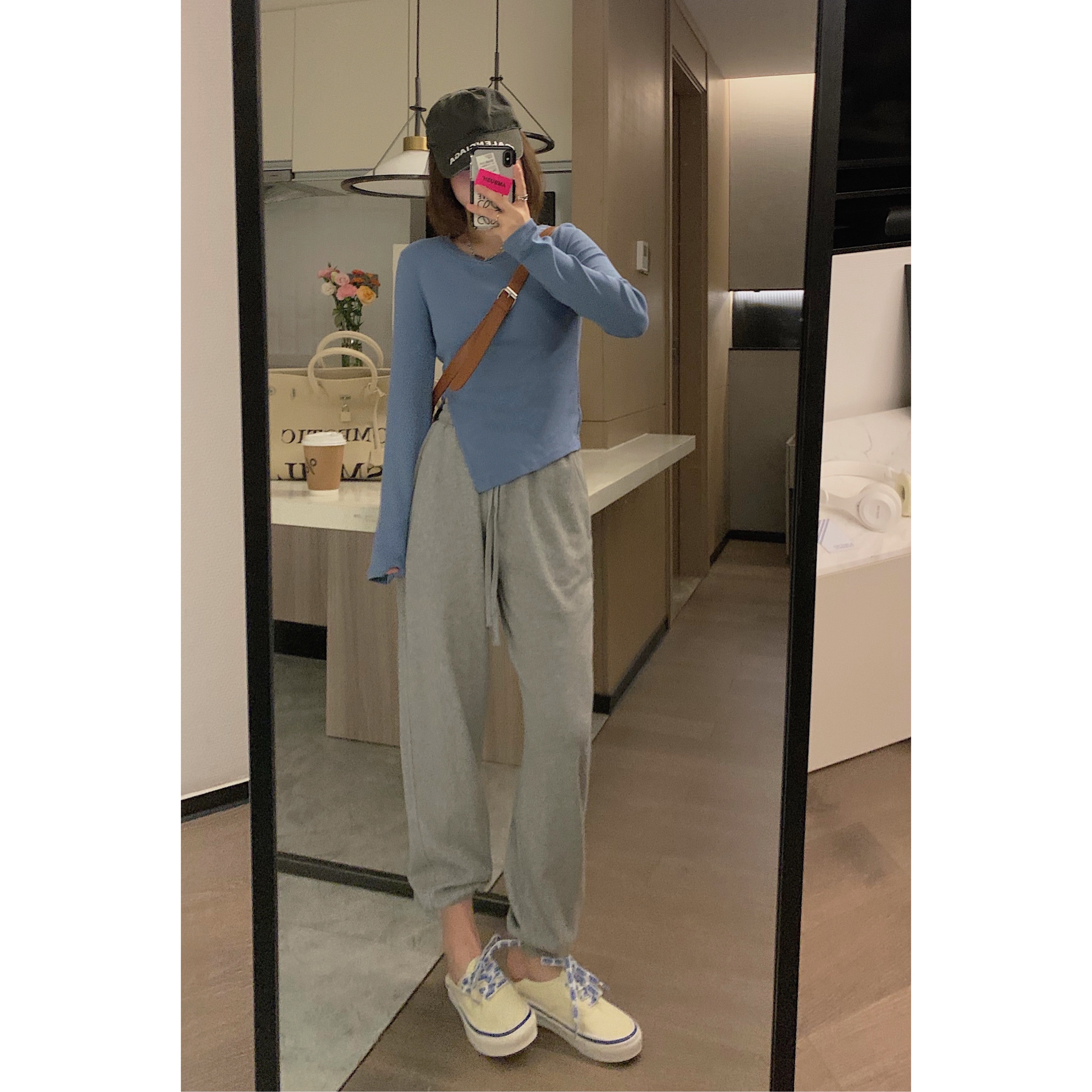 Veee A4 waist design feeling thin hot girl Short slanted edge split multi-color wild long sleeve T-shirt bottoming top