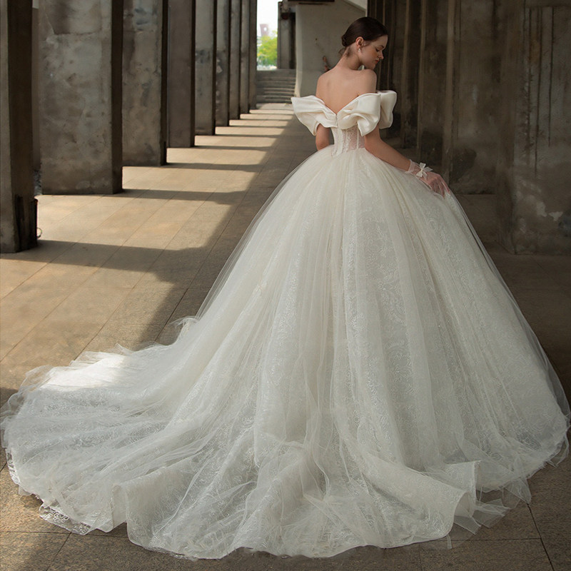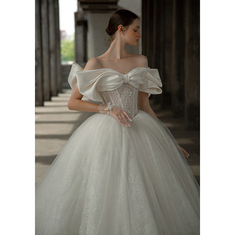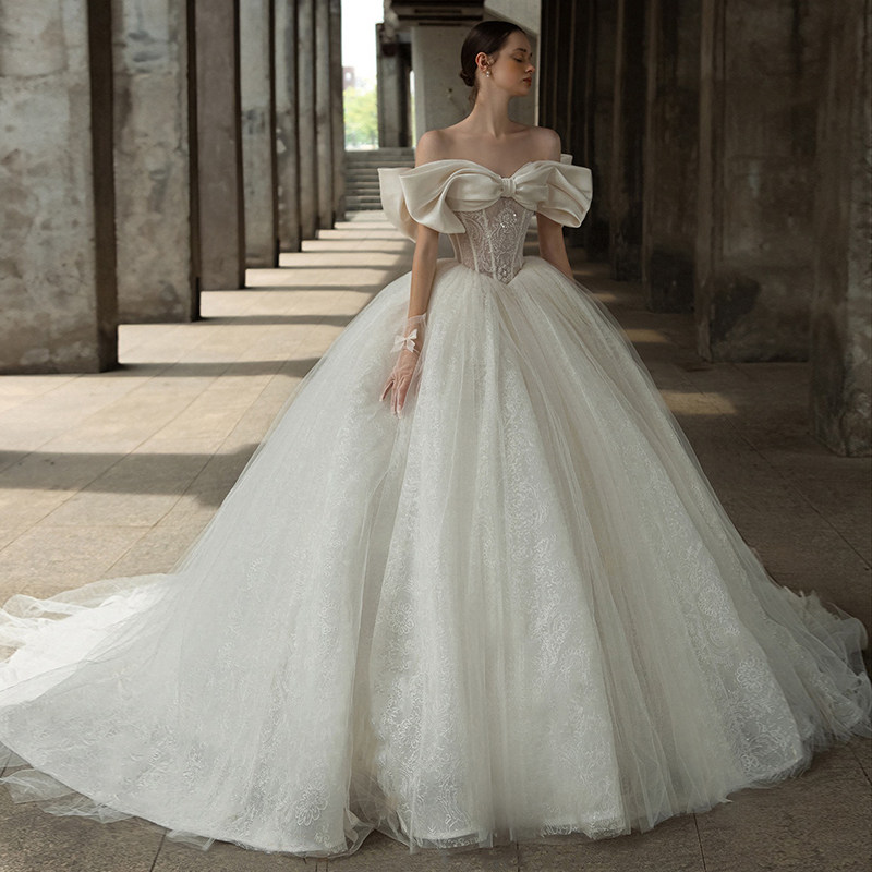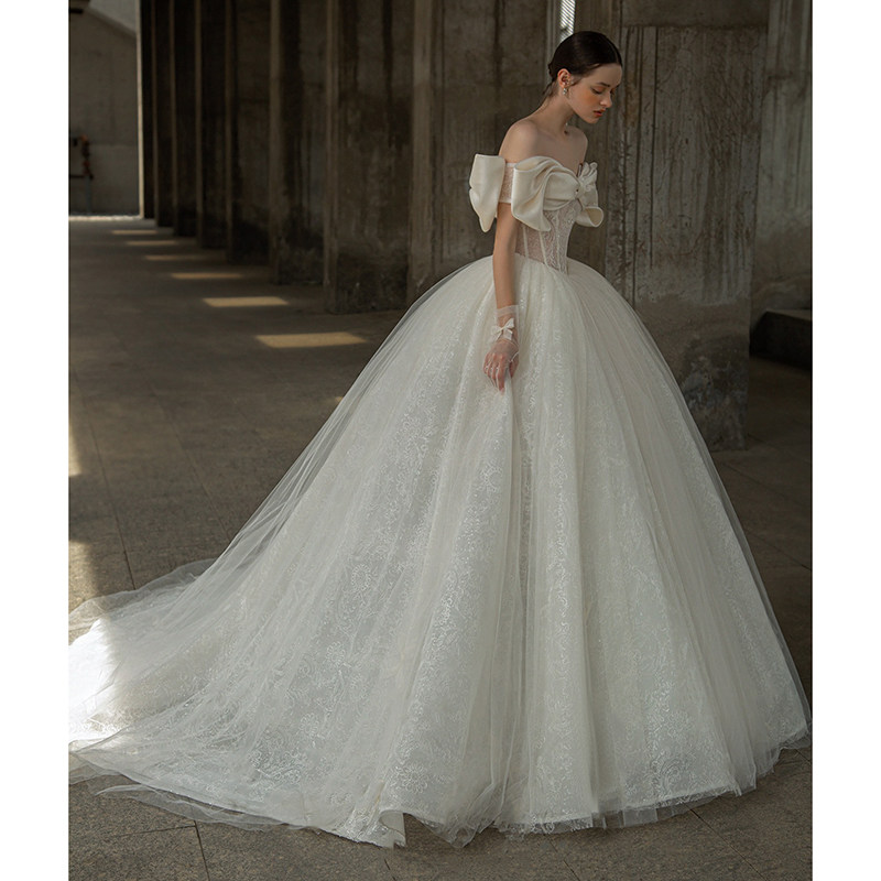 Straight Shoulder Main Wedding Dress 2021 New Bridal Satin Reworked Luxury High Sense Palace Wind 2022 Big Trailing Light