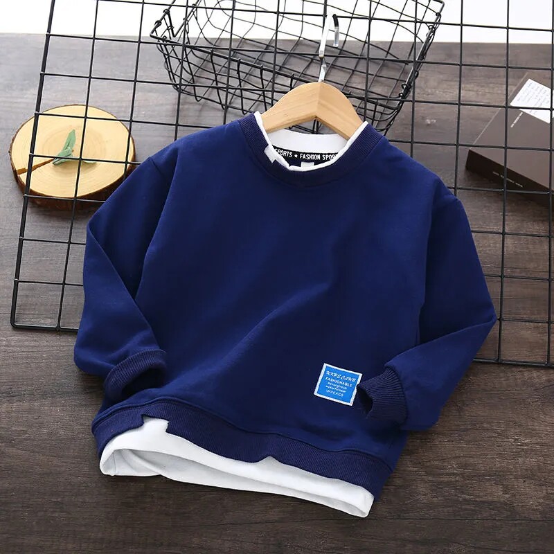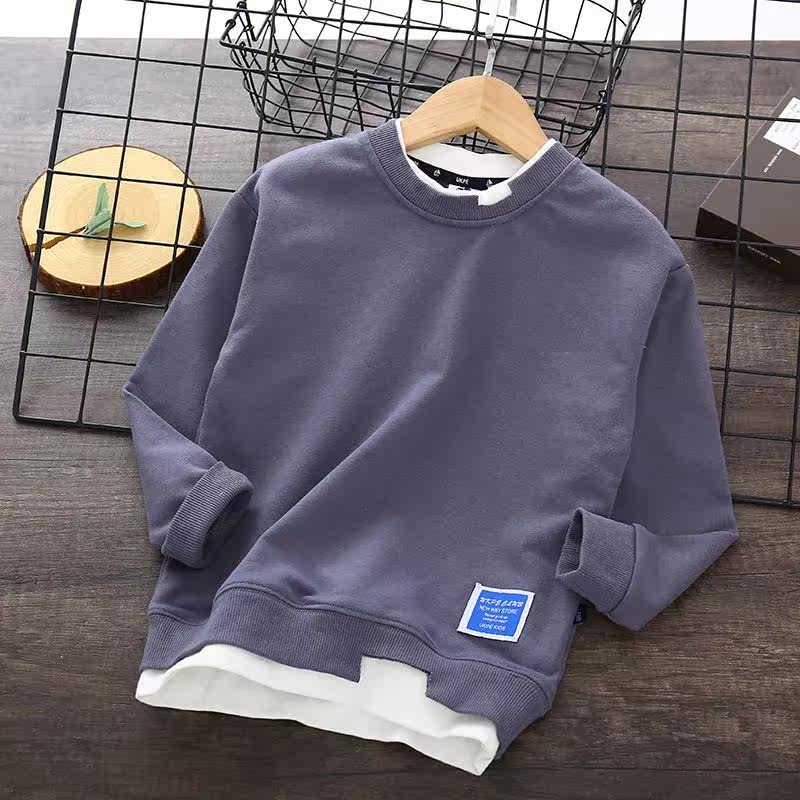 Boys' sweater 2021 autumn style children's spring style boy spring and autumn trendy style foreign style fake two pieces of pure cotton plus velvet for big children