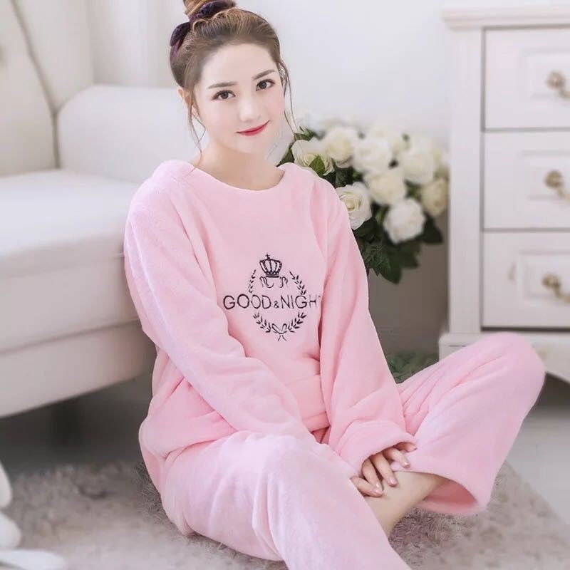 Winter flannel pajamas women's thickened autumn long-sleeved coral fleece pullover student pajamas set warm home service