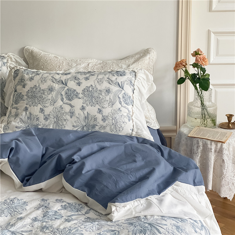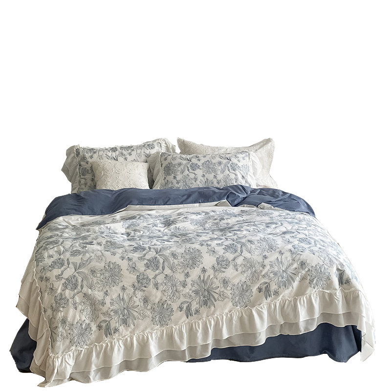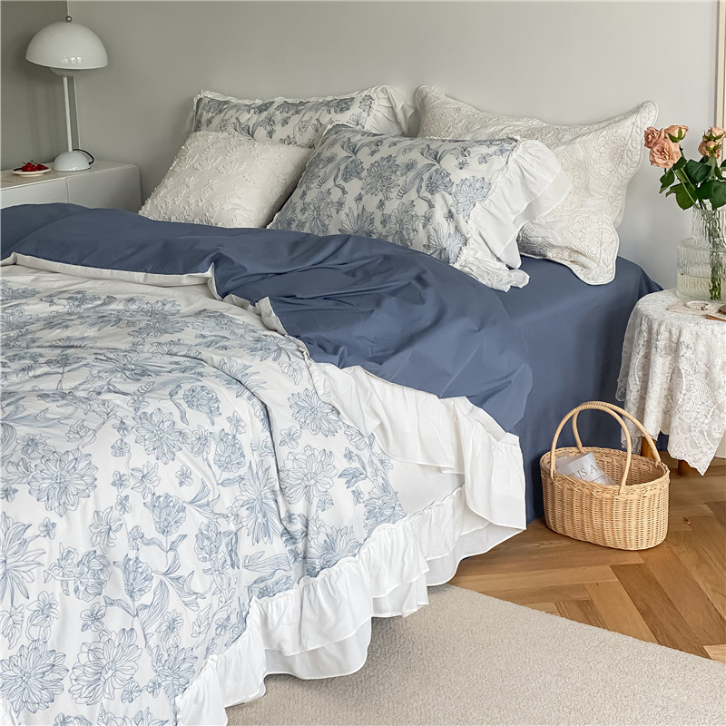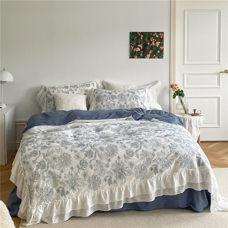 Korean-style retro pastoral bed four-piece set of pure cotton washed cotton double-layer ruffled forest flower bedding