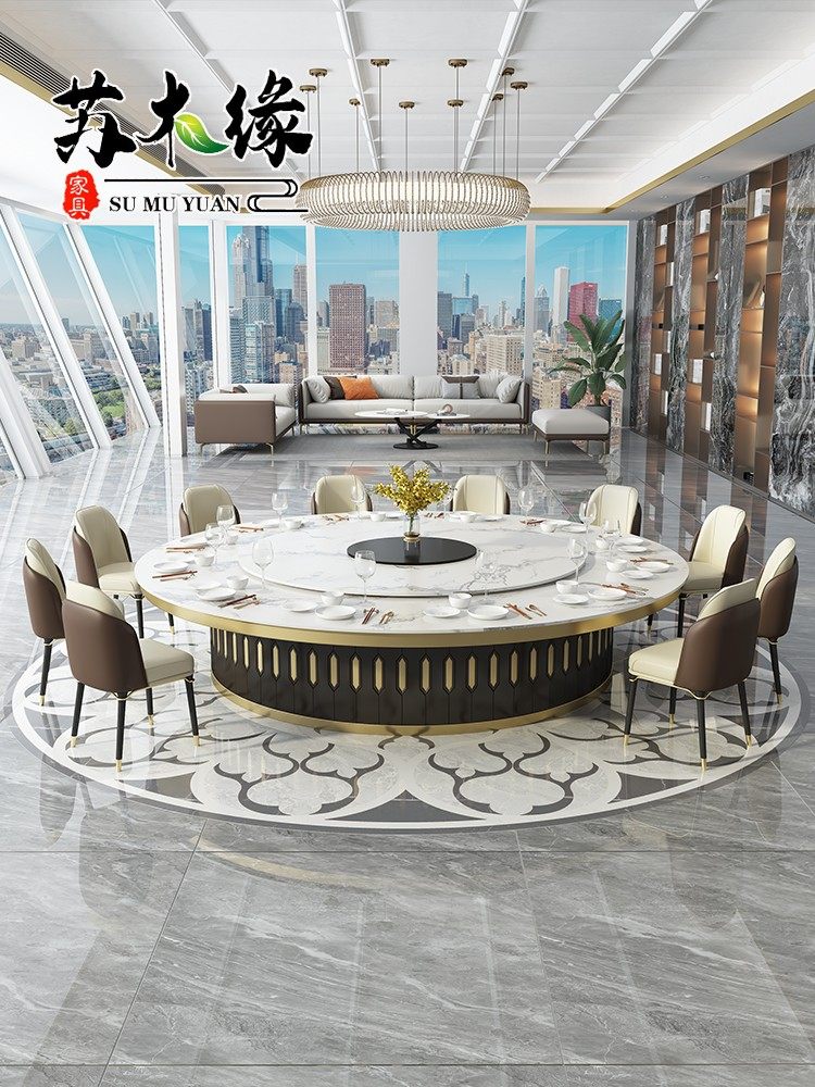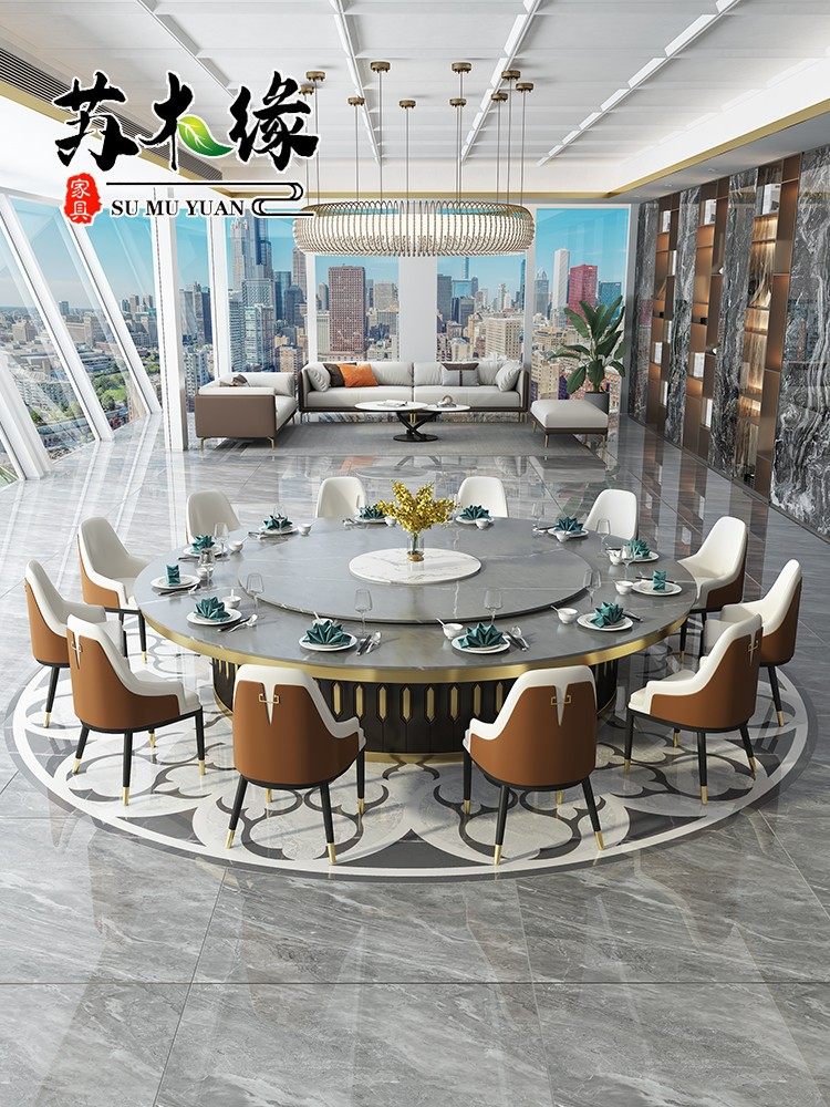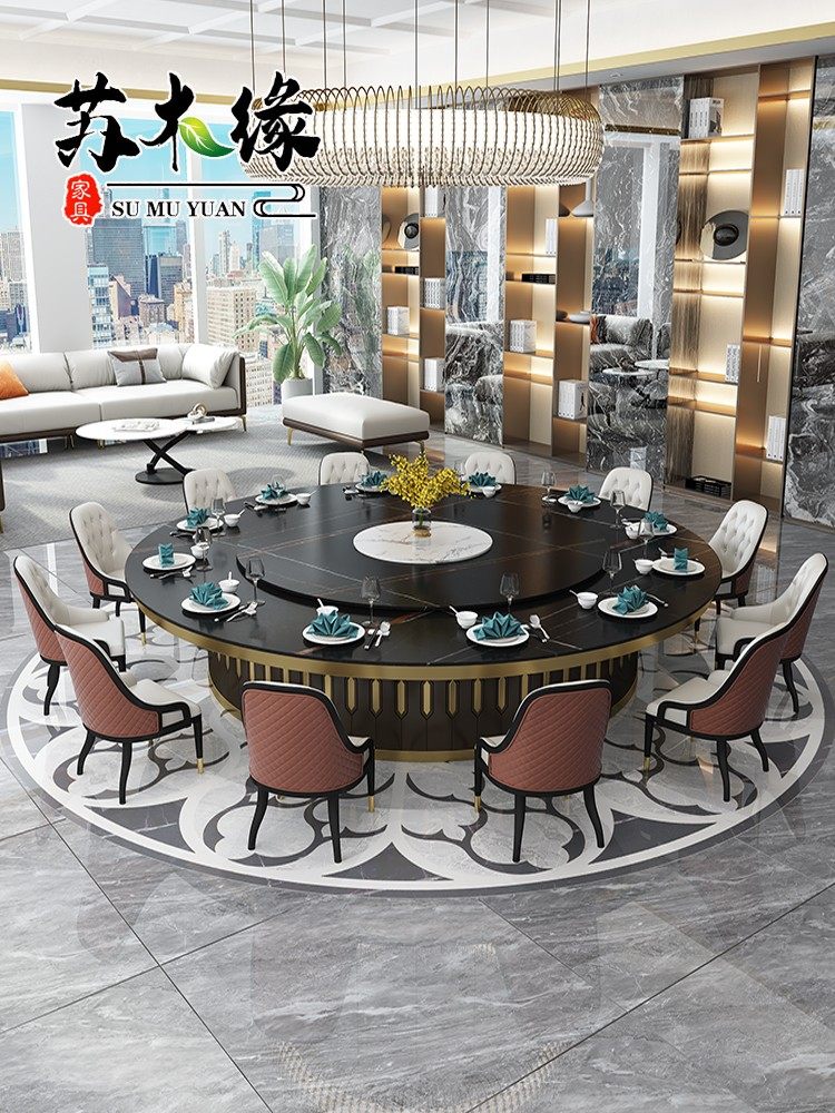Hotel electric dining table large round table and chairs marble slab invisible induction cooker hot pot table light luxury club 15 people 20