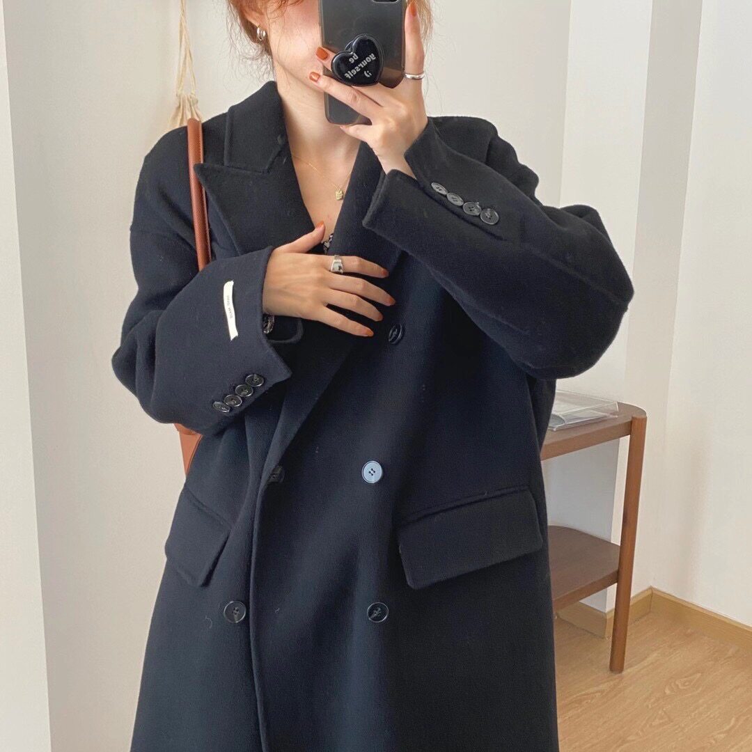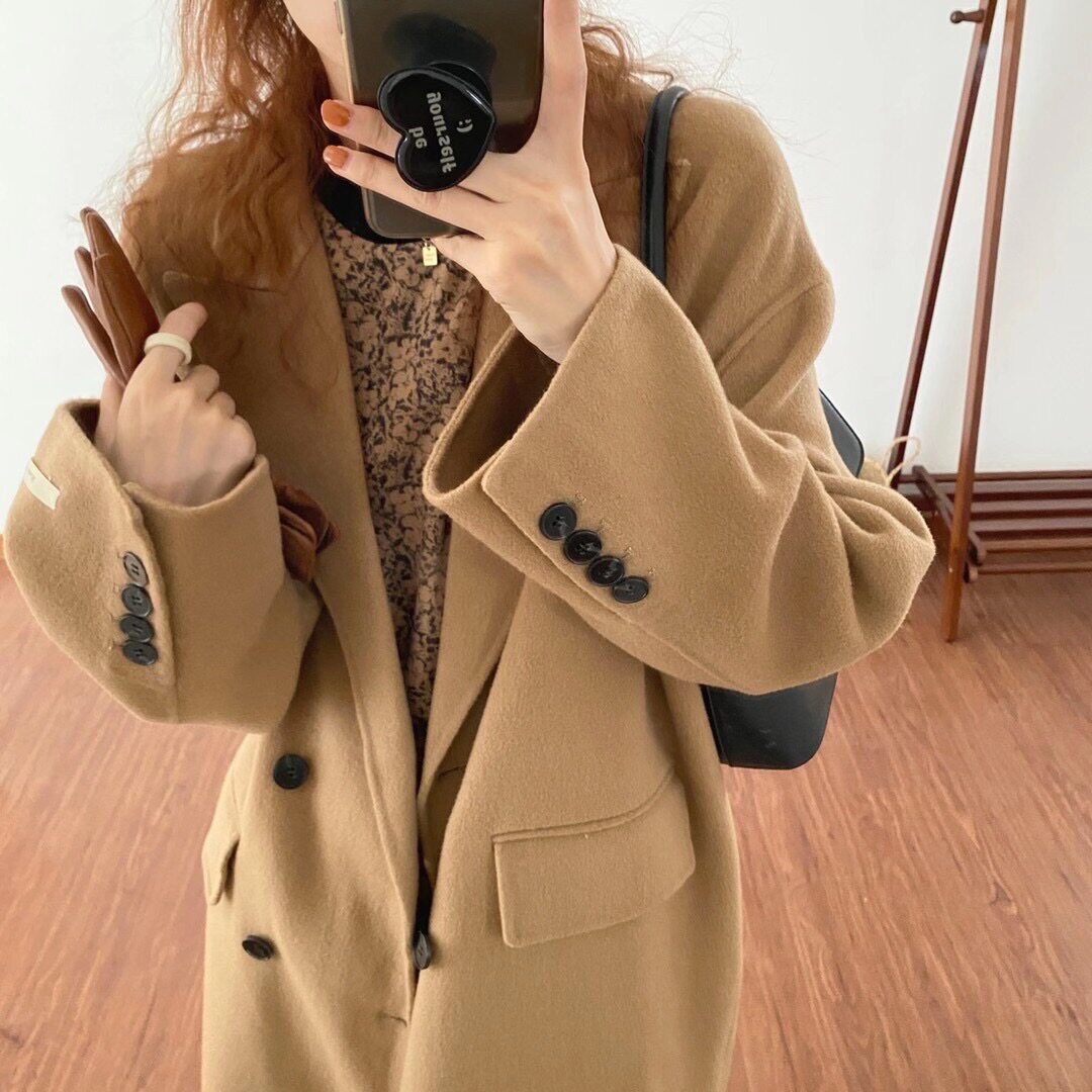 Grey bifacial cashmere big coat female medium long version 2021 New Korean version Western suit collar double-row buttresses fur coats women