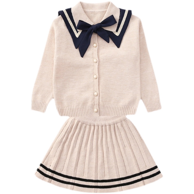 Korean Version Girl Knit Suit 2021 Fall New Children's Sleeve Dresses Big Boy Foreign Pie Academy Wind Two Sets D