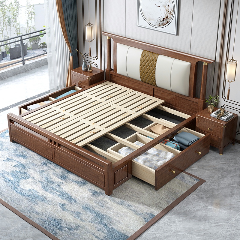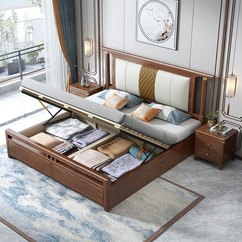 New Chinese style solid wood bed walnut master bedroom high-end leather soft bag backrest double large bed storage bed home wedding