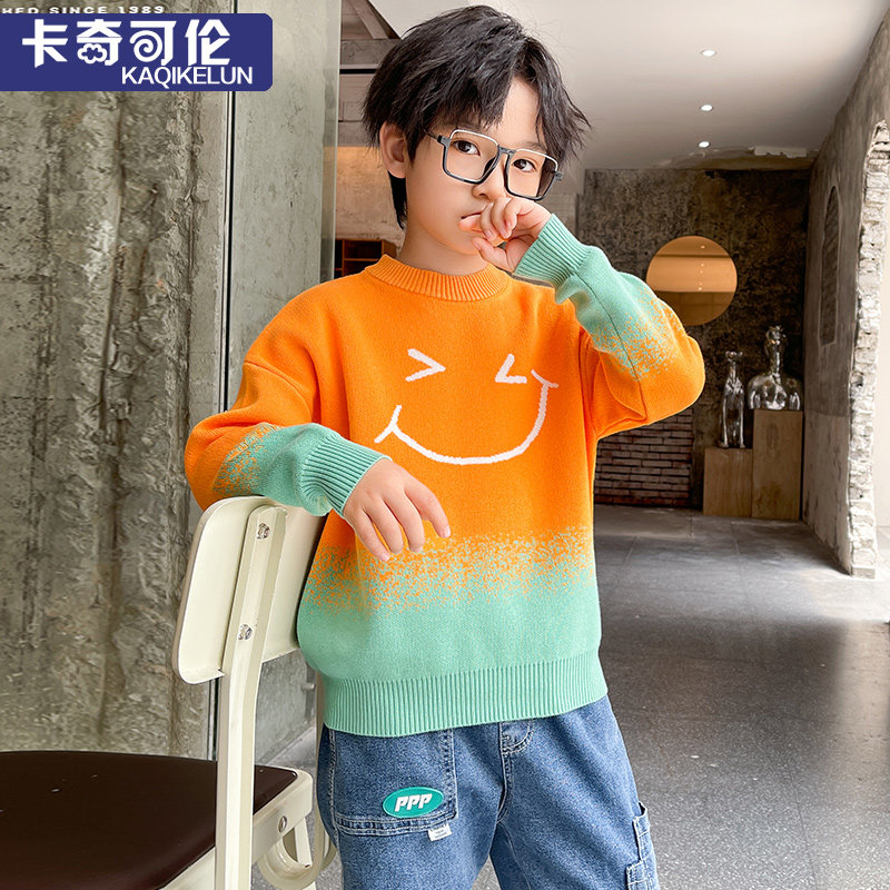 Boy sweater jacket head autumn winter 2022 new gush thickened children's knitted sweatshirt CUHK Scout bottom pure cotton inner lap