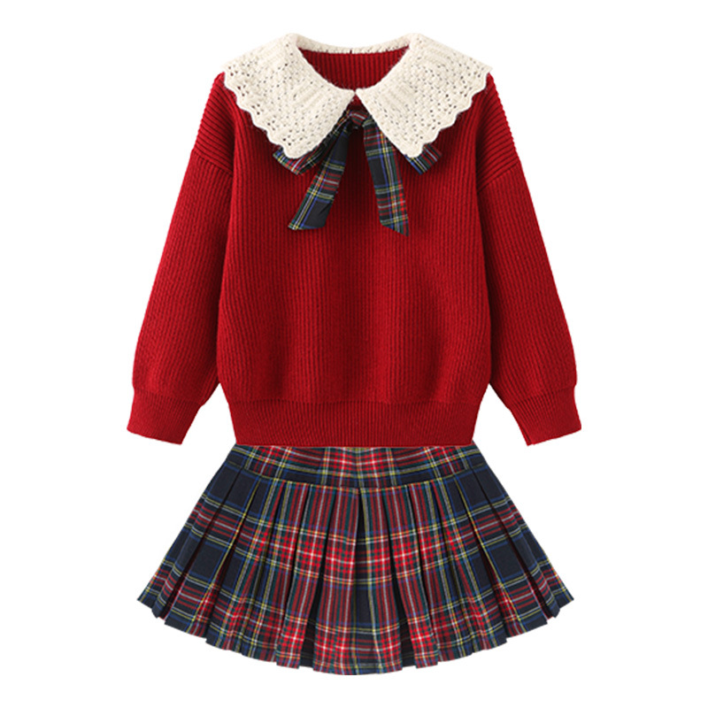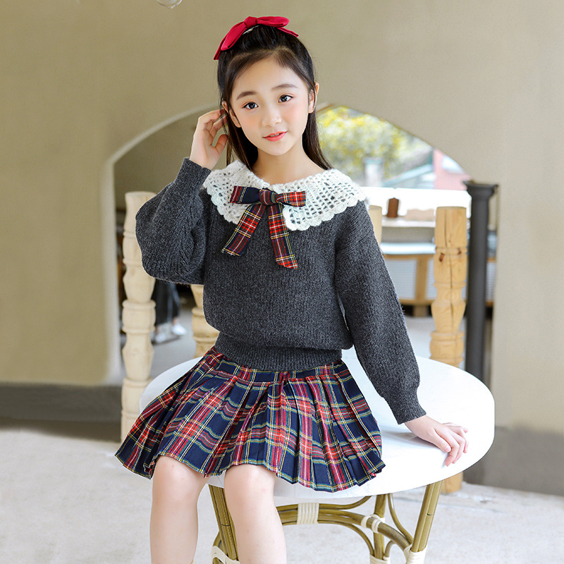 Girl Suit Dress Autumn Dress New Foreign Pie Net Red Explosive Children Clothes Little Girl College Wind Needle Weaters Two Sets Skirt