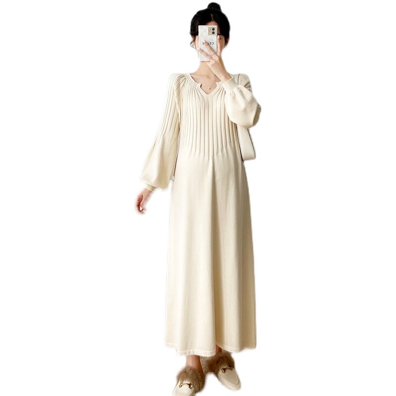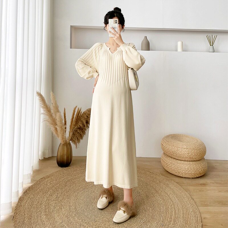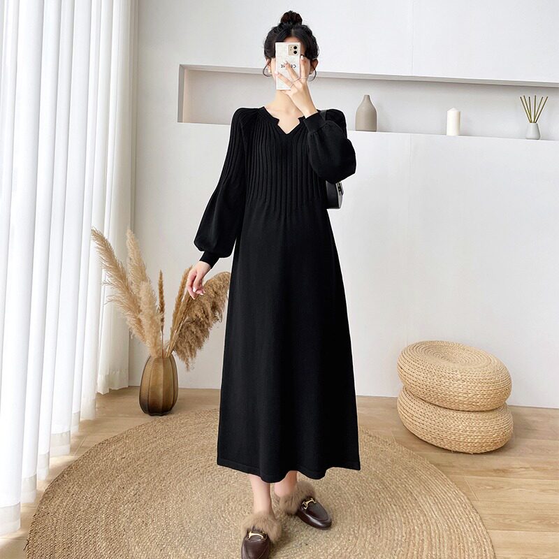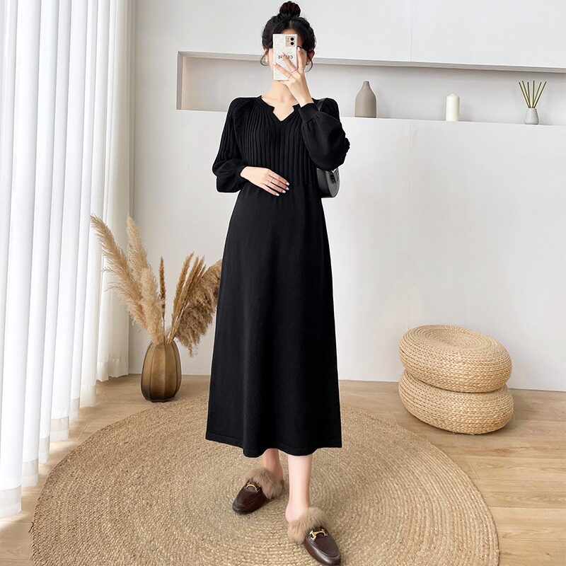 Pregnant women's autumn dress knitted autumn and winter long sleeve fashion v-collar long style inside and outside wear knee commute solid color