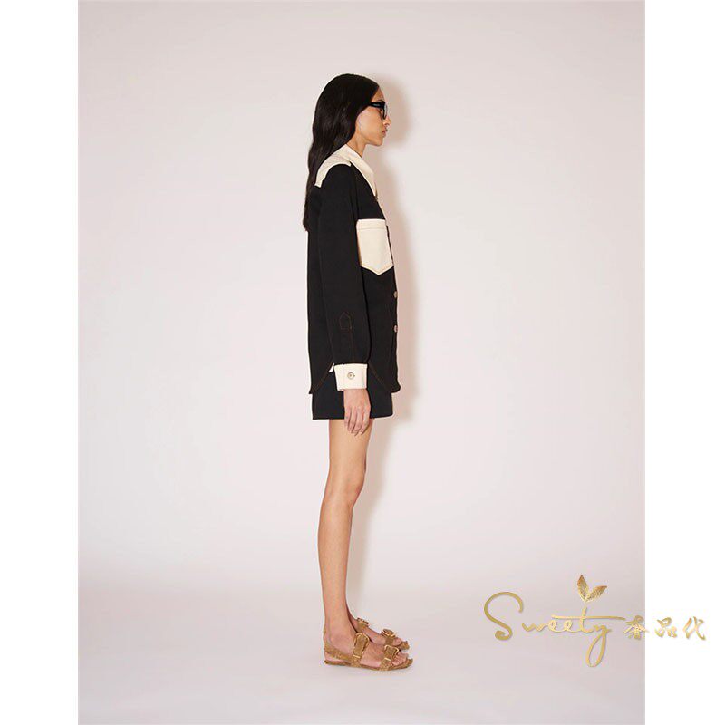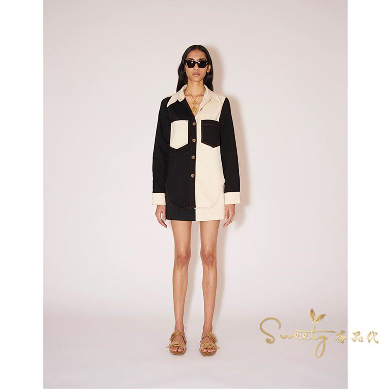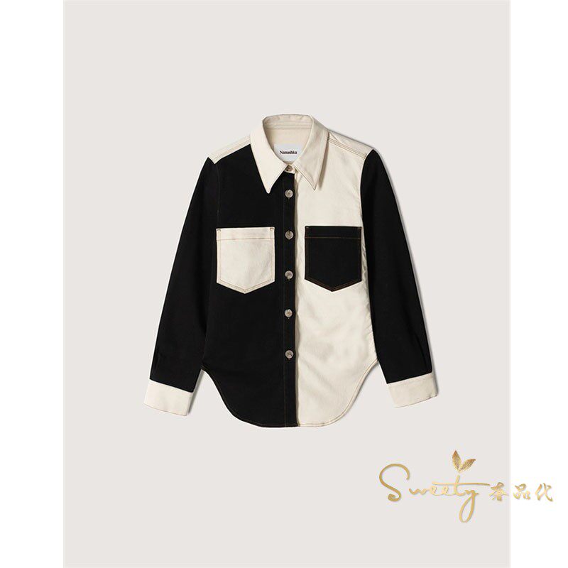 Small number of spot Nanushka 21 autumn winter new black and white splicing eco-friendly leather PU pocket denim shirt woman
