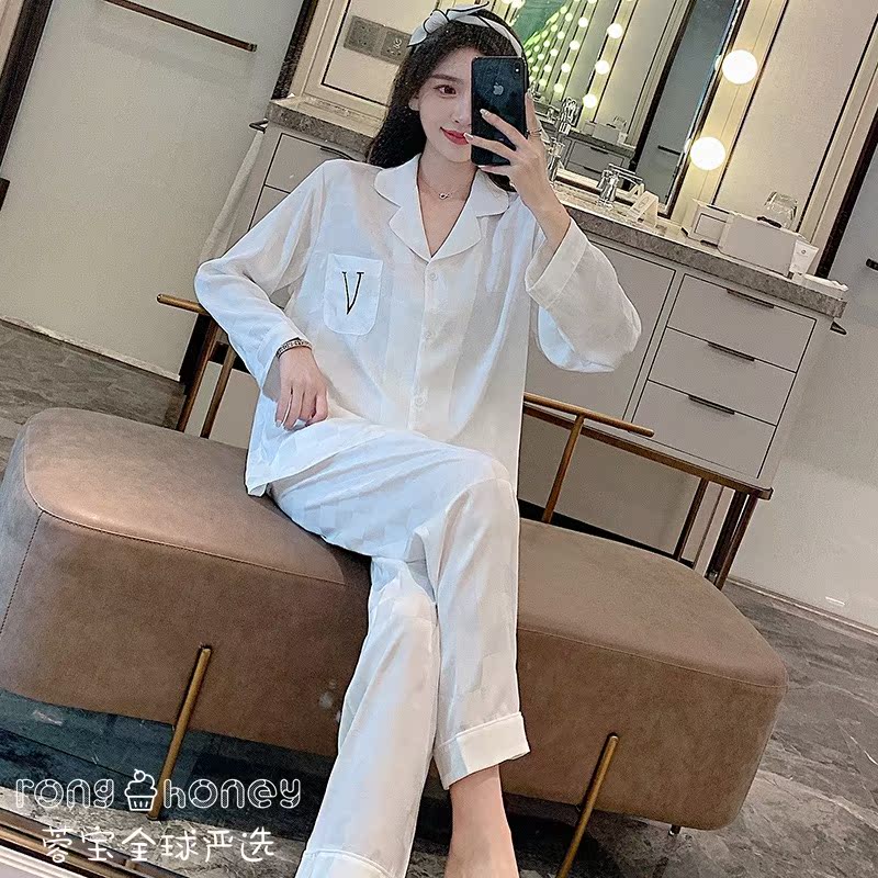Japan Vs White Plaid Pyjamas Woman Spring Autumn Ice Silk Long Sleeve Emulation Silk Air Conditioning Suit Home Suit Suit