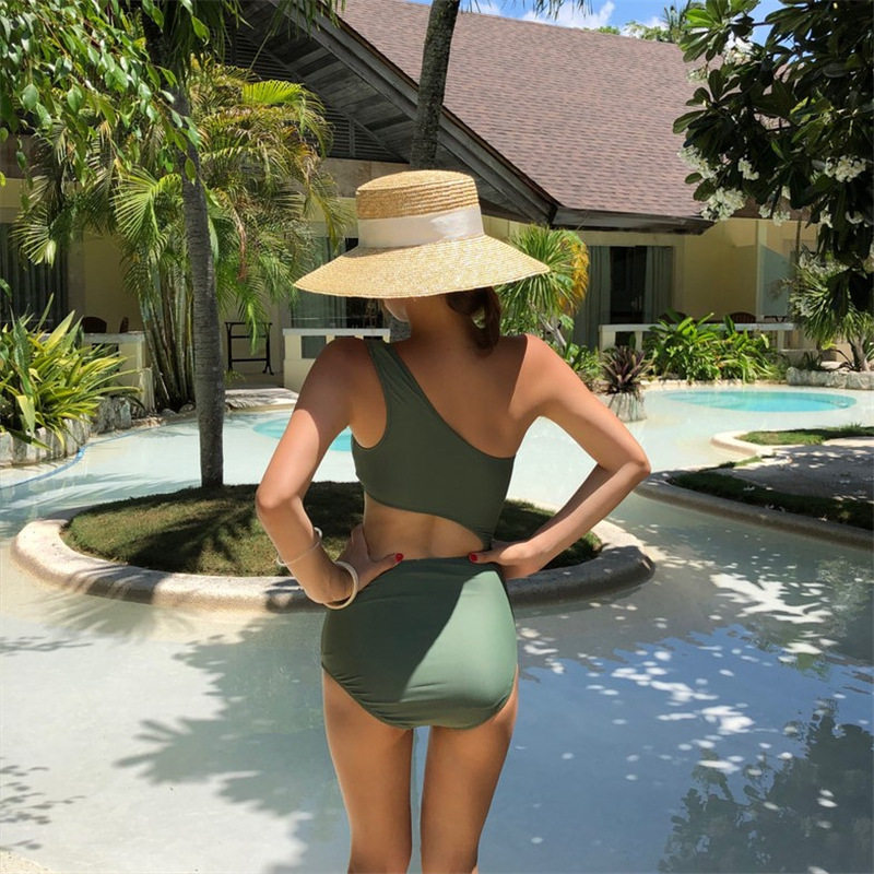 2021 Internet celebrity hot style pure color single shoulder strap chest pad covering flesh one-piece casual hot spring sexy high waist swimsuit for women
