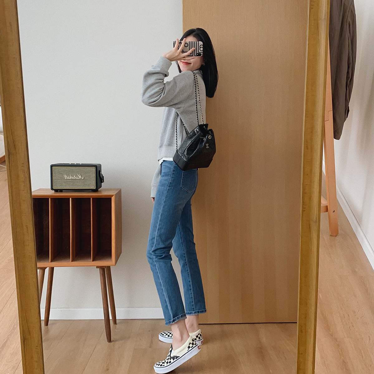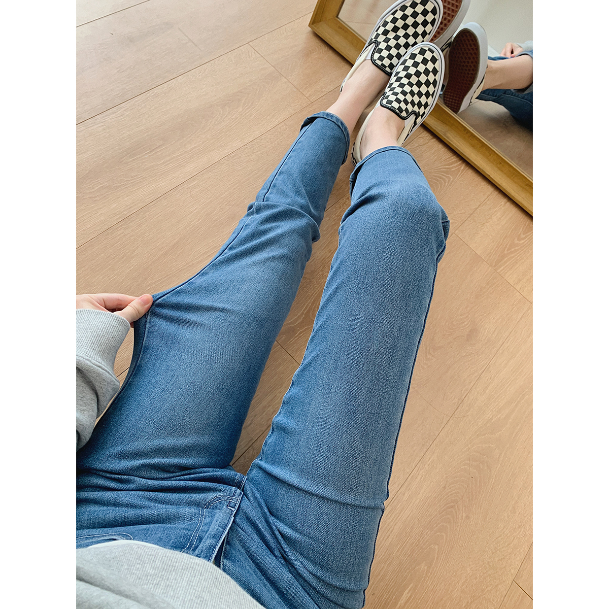 Big Ding homemade double-strand yarn cotton high waist elastic small straight jeans women autumn thin ankle-length pants