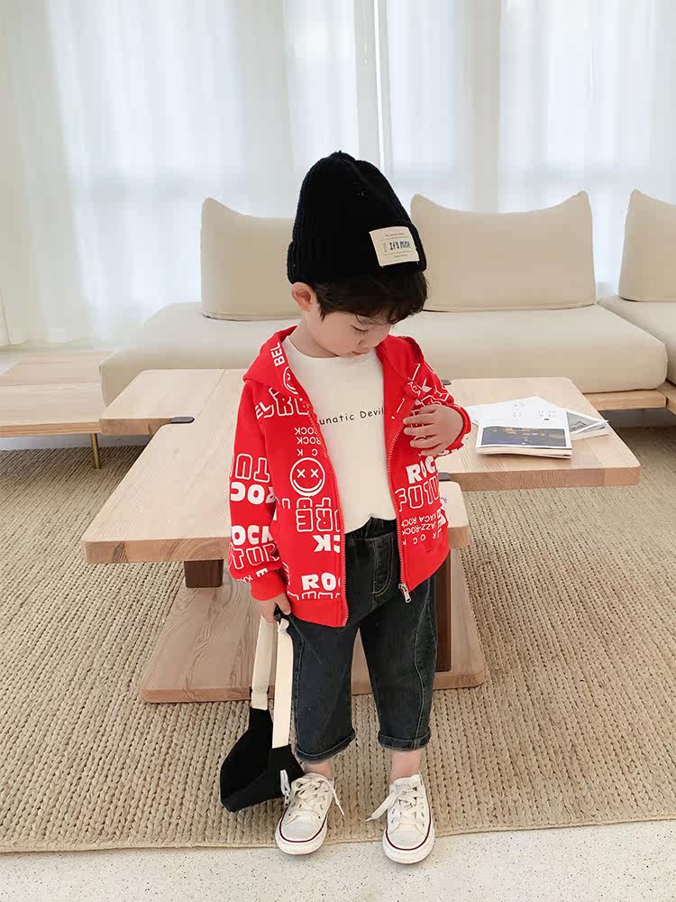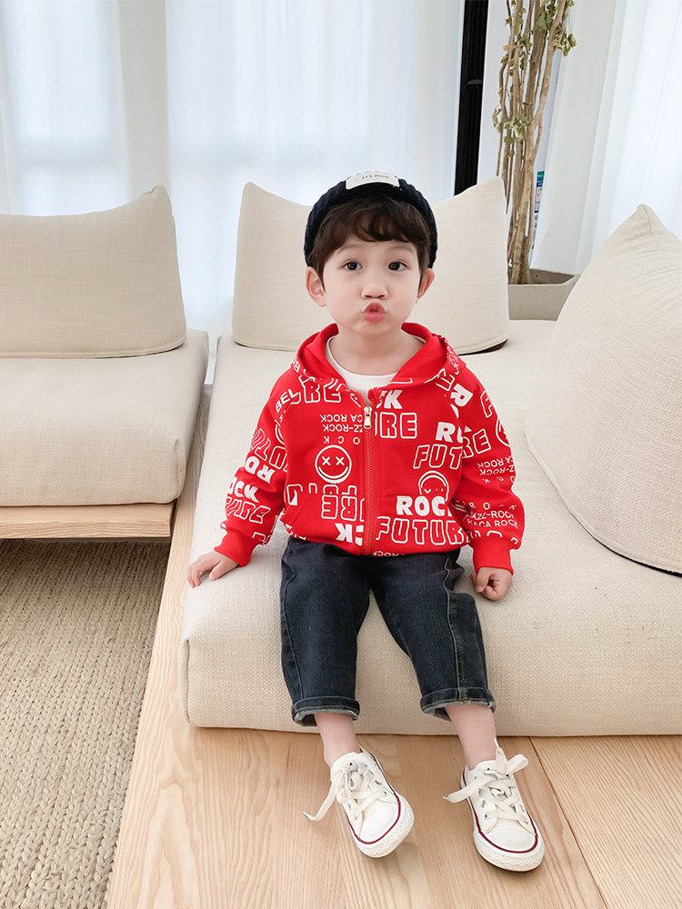 Boys Sweater 2021 Autumn Children's Spring Boys Spring and Autumn Hooded Cardigan Long Sleeve Letter Print Autumn Red