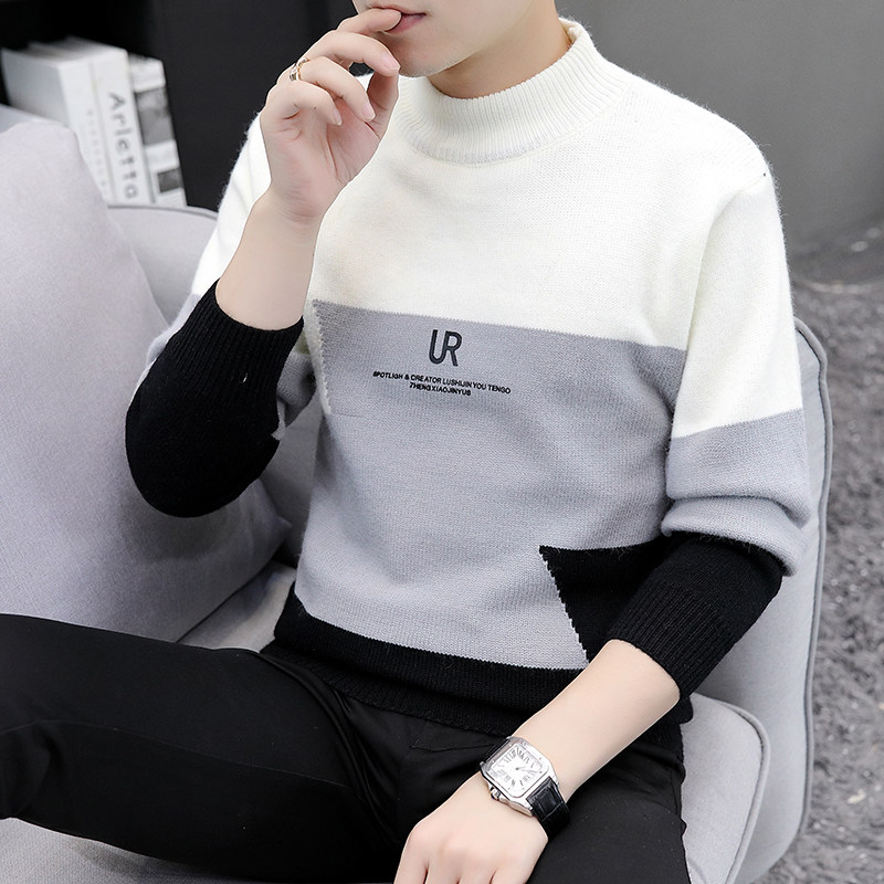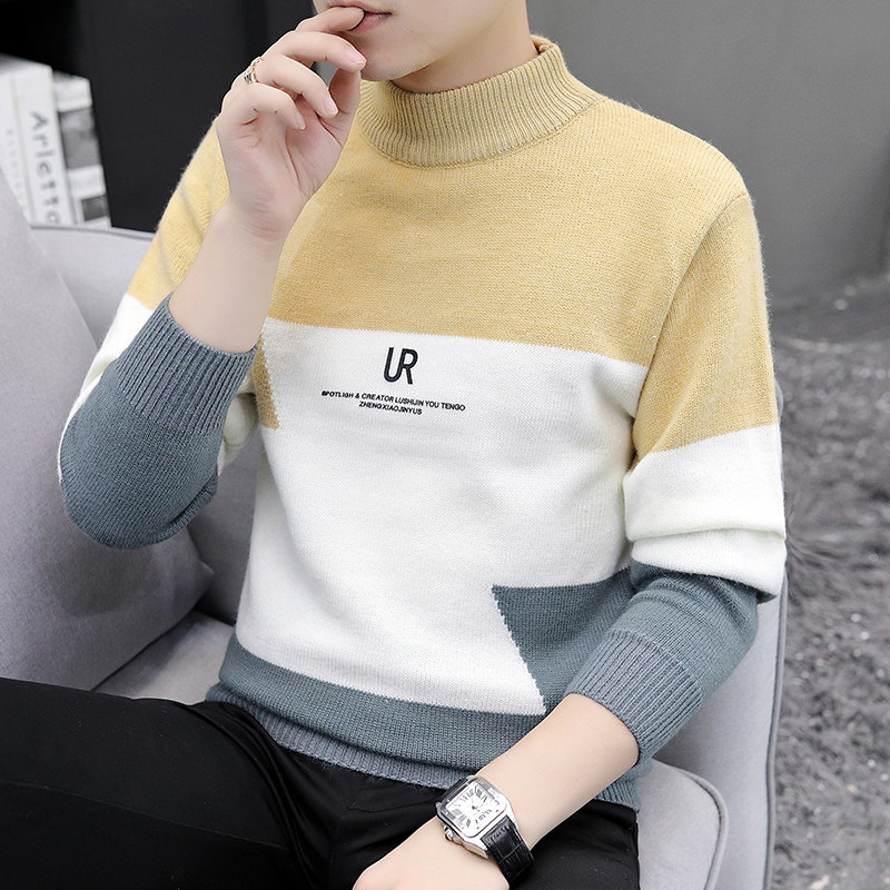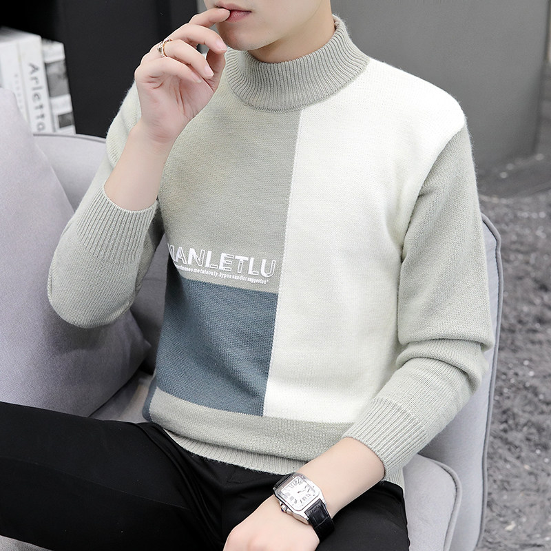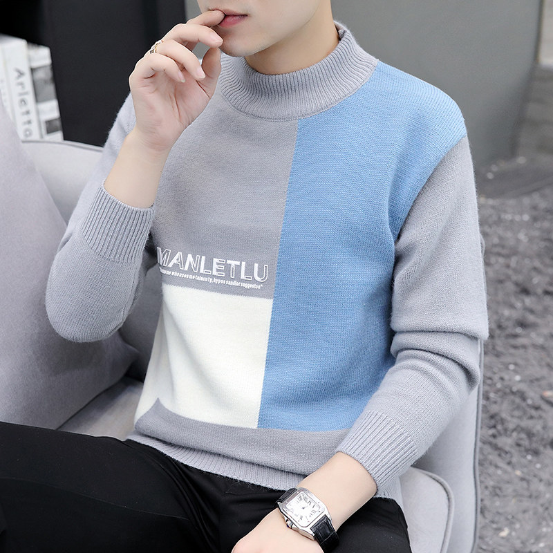 Semi-turtleneck sweater male handsome stitching color mid-collar knitted base shirt autumn and winter Korean slim trend sanitary clothing