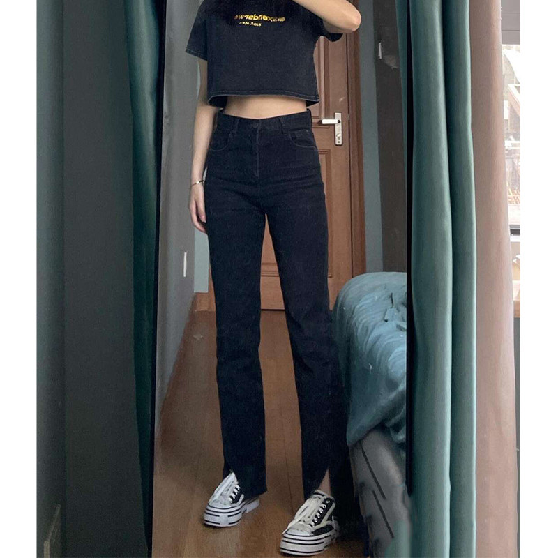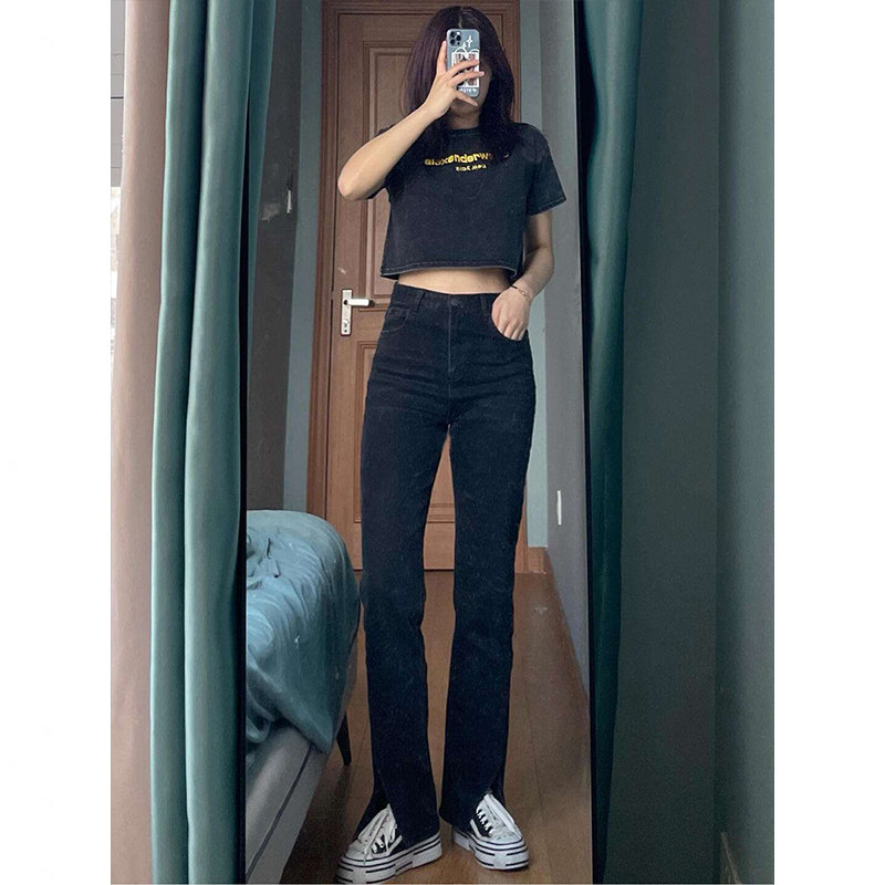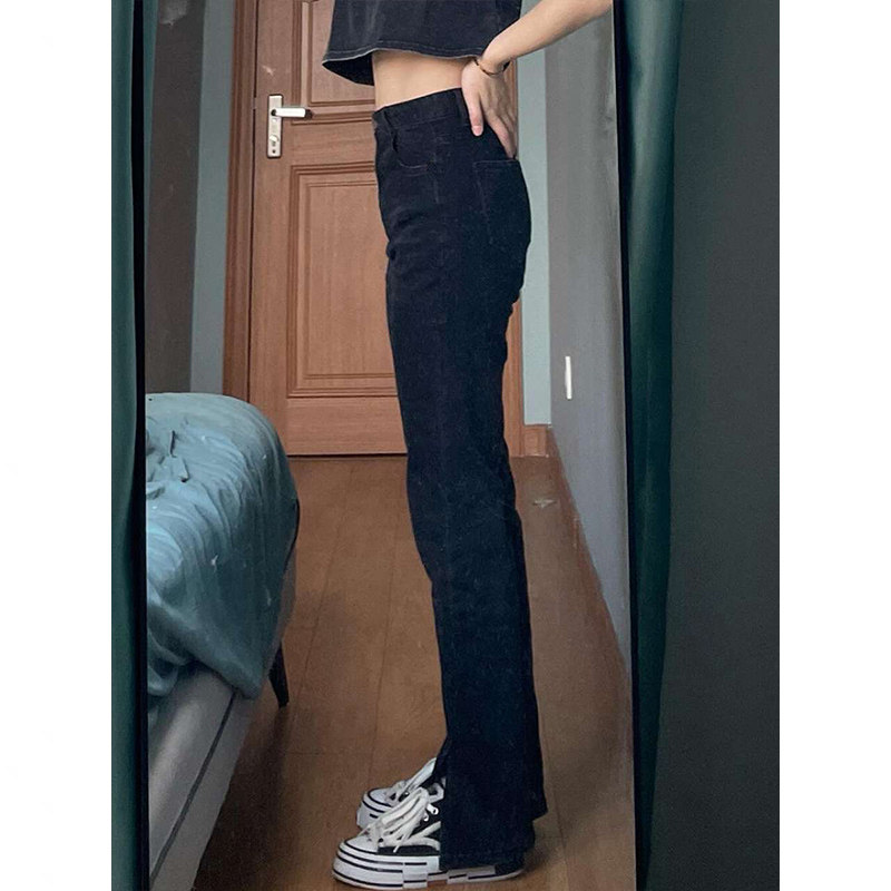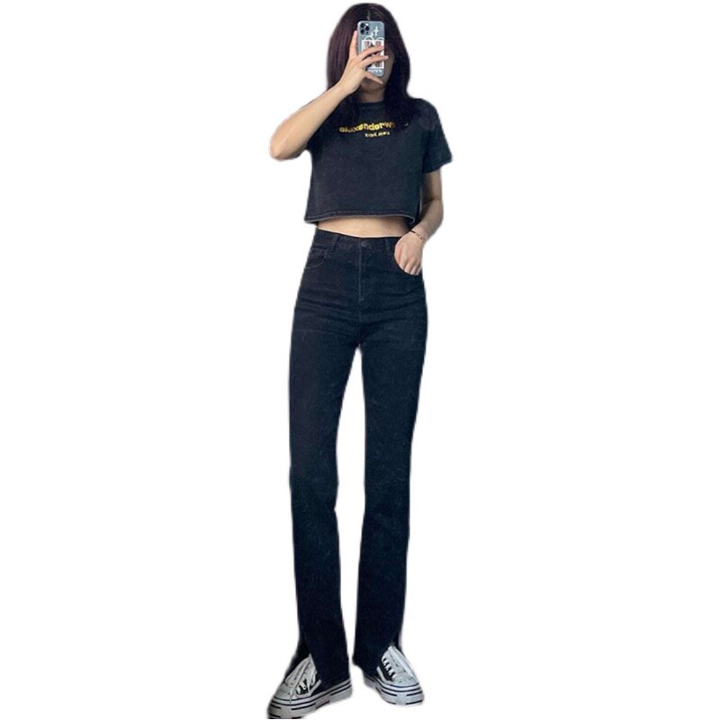 Thin pants pear-shaped figure thick legs wide hips fat large size mm split jeans women's spring black straight flared pants