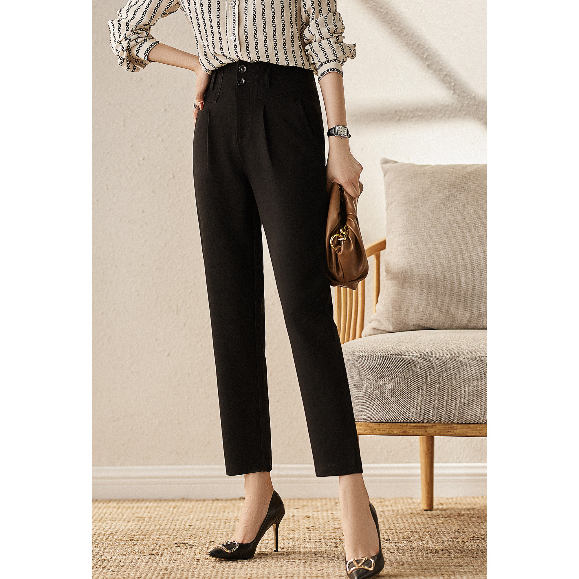 The female pants are high in the waist.: