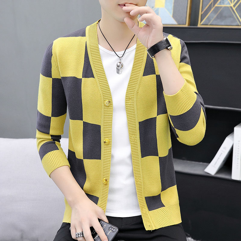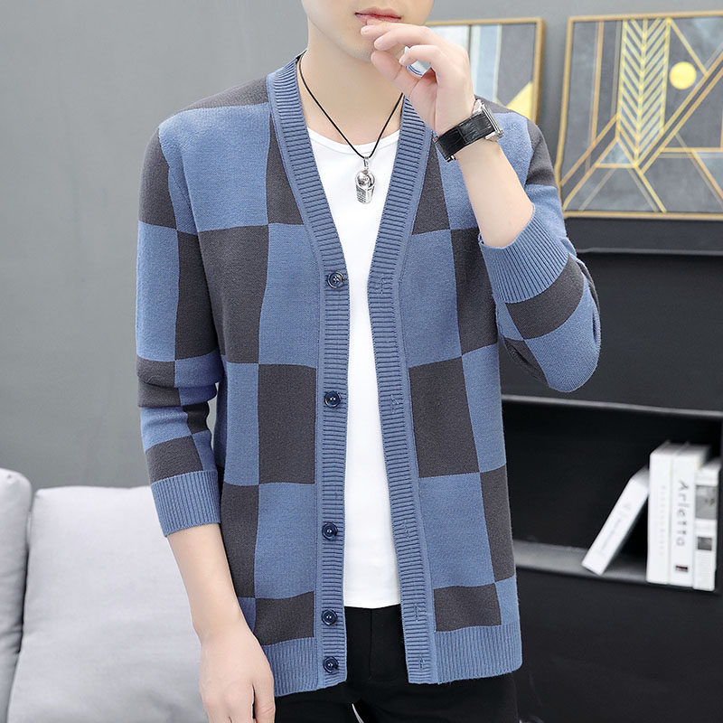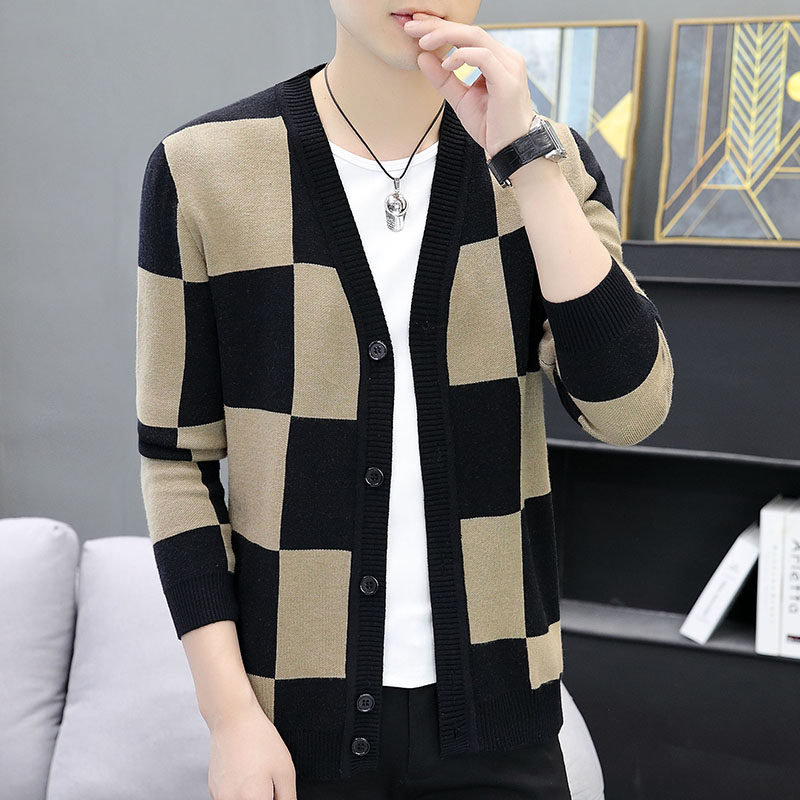 Youth casual plaid sweater cardigan sweater jacket men's spring and autumn thin Korean slim trend men's clothing