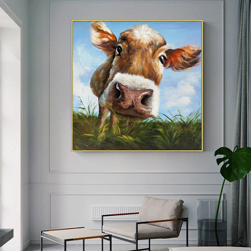 Pure hand-painted oil painting Nordic style decorative painting animal hanging painting personality cow mural bedroom children's room handmade large