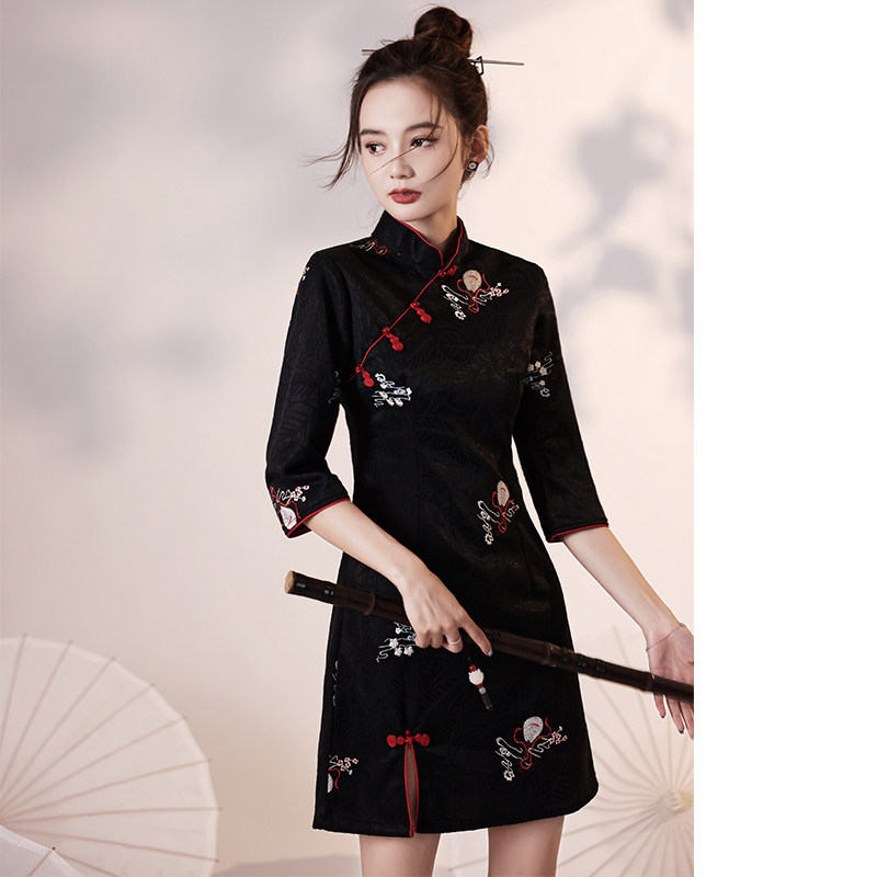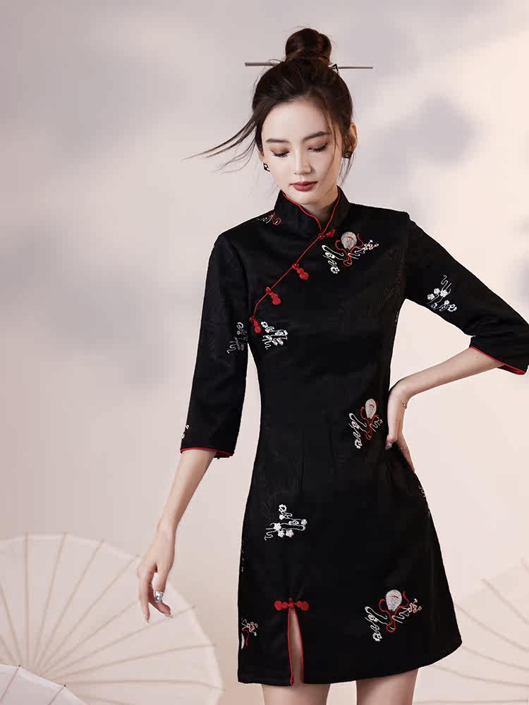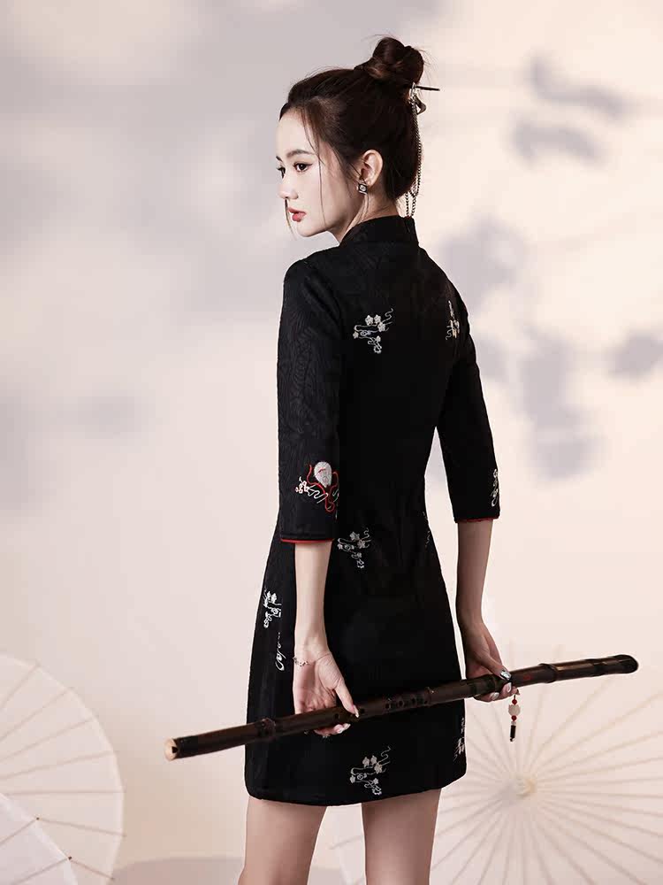 Black Qipao 2022 New Autumn Winter Improved National Tide Fried Street Young small sub-Chinese Wind mid-sleeve short