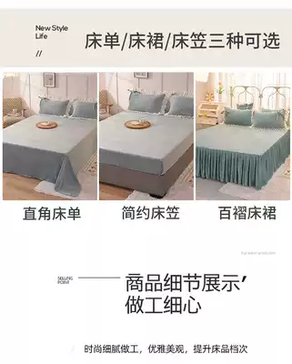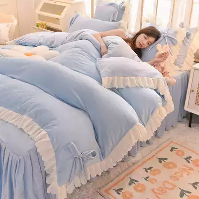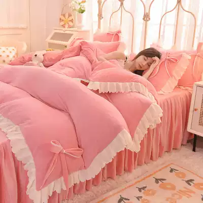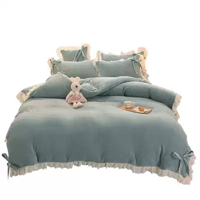 Korean milk velvet bed skirt four-piece girl heart Princess lace anti-static quilt cover coral velvet bed sheet bed