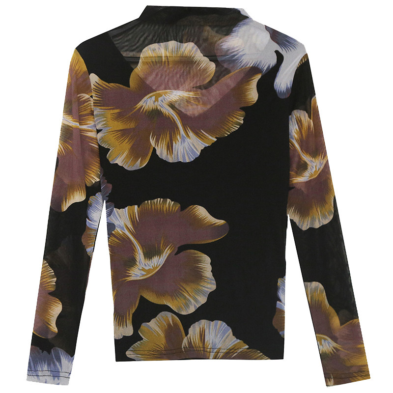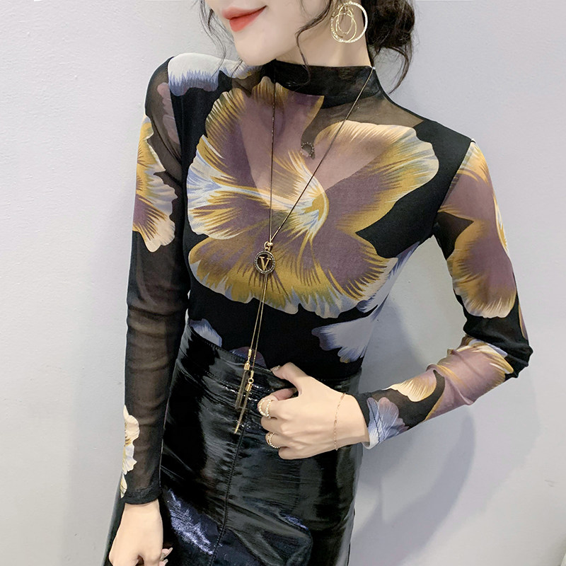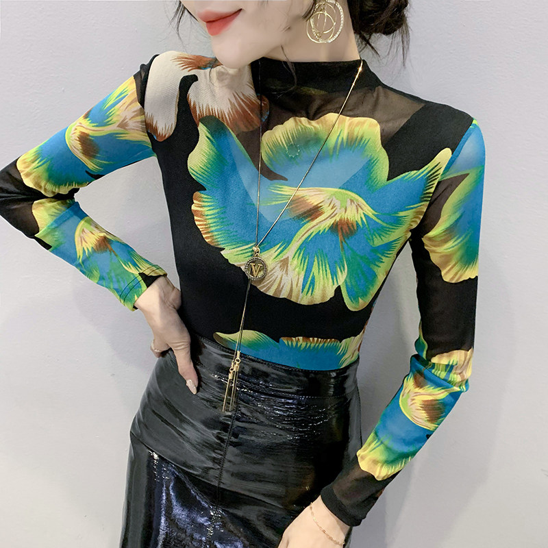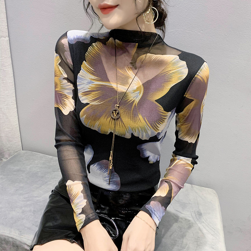 European station 2022 autumn and winter new fashion semi-high-neck printed T-shirt with long sleeves and a Western-style mesh bottoming shirt trend