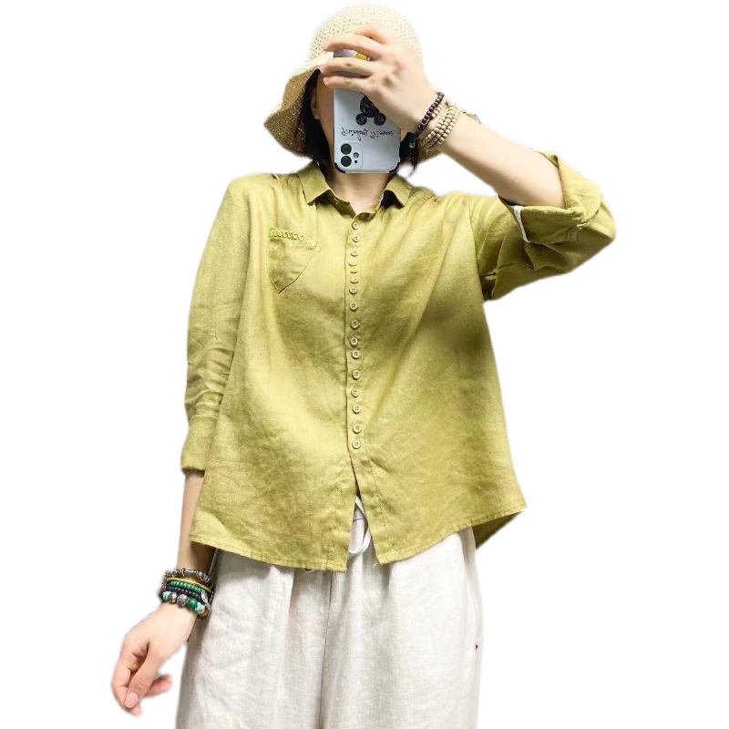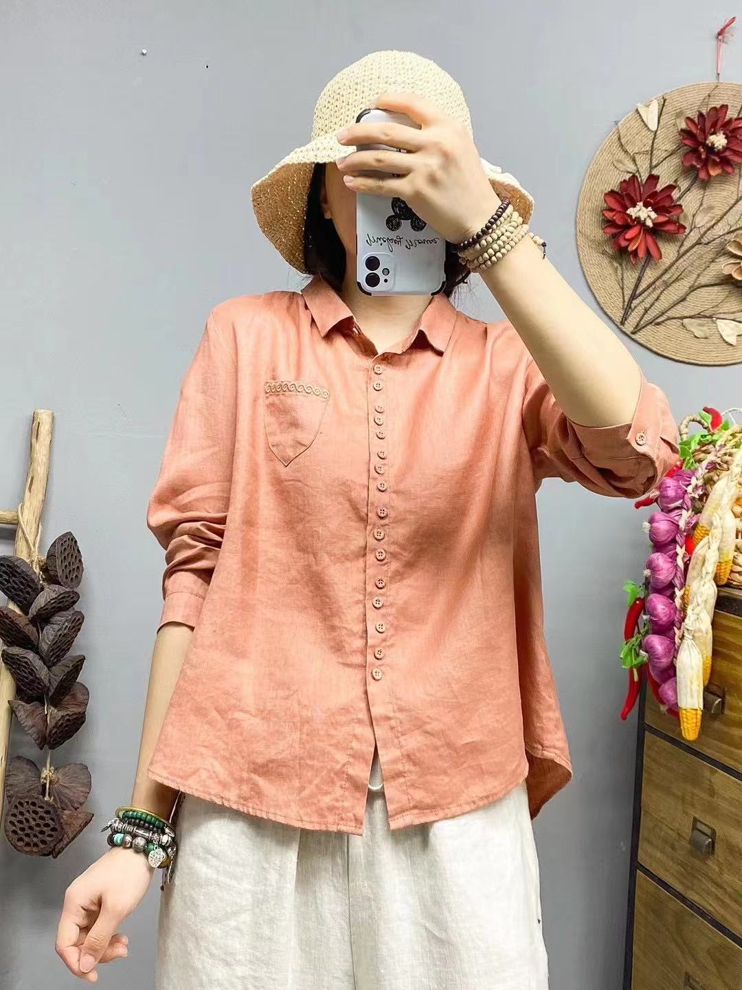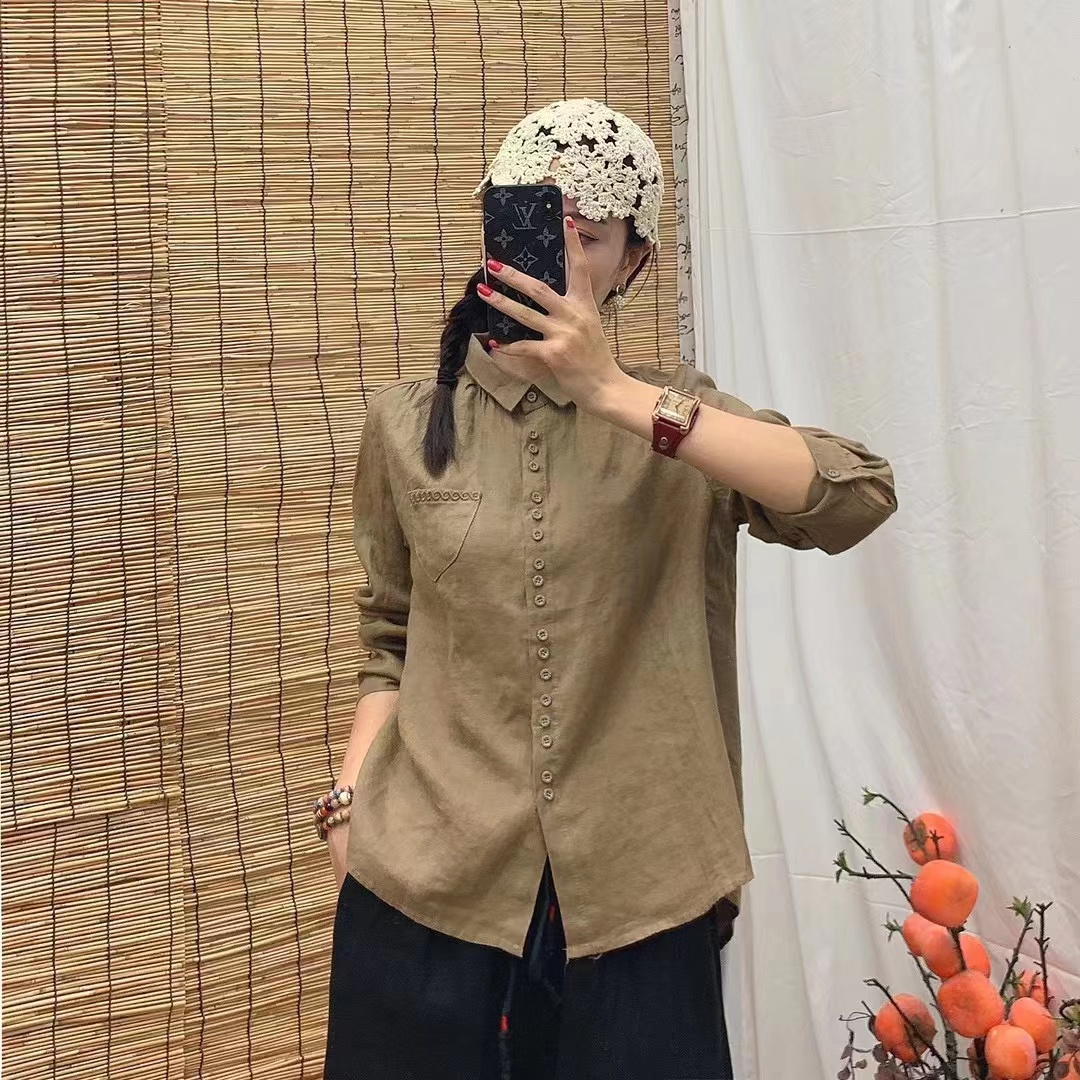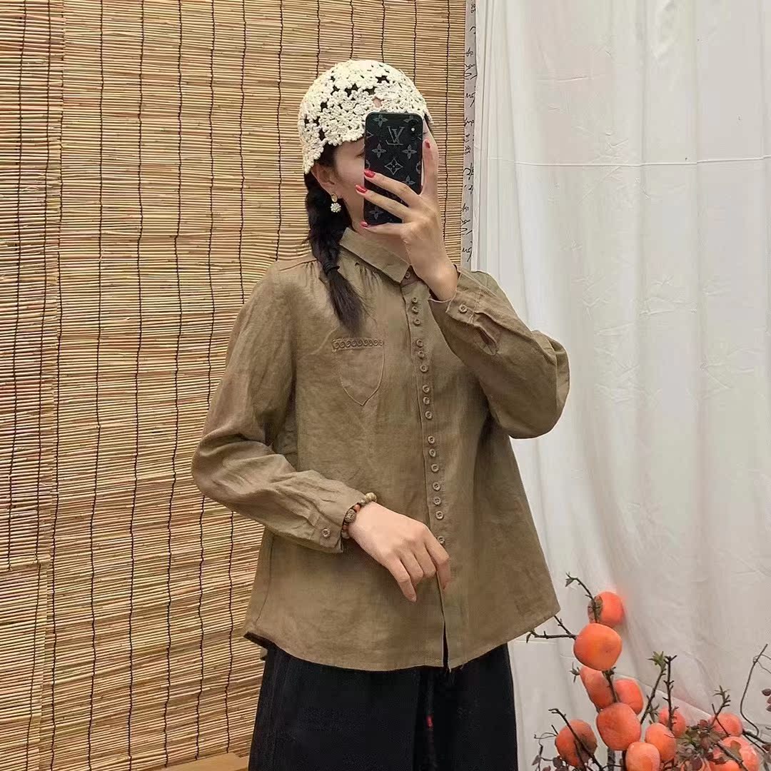 Retro Pure Linen Button Lapel Pocket Design Literary Style Shirt Slim Top Loose Temperament Versatile Long Sleeves