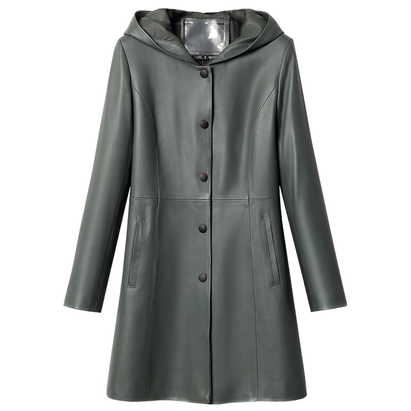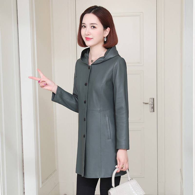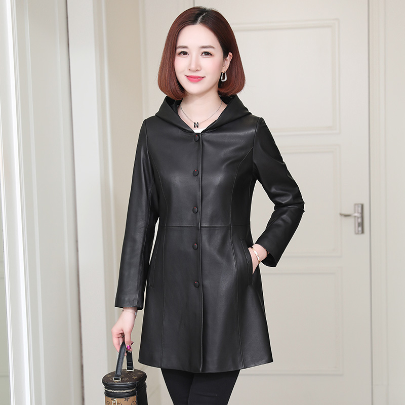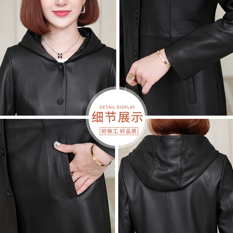 Henning genuine leather clothing female medium long version plus hypertrophy clothes spring autumn high-end tandem hat leather jacket sheep leather windsuit jacket