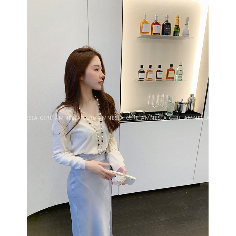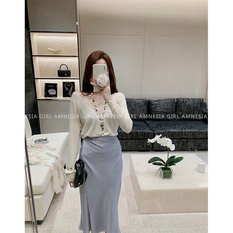 Eleven girls white wool knitted top women's 2021 early autumn temperament gentle wind eyelashes lace bottoming shirt