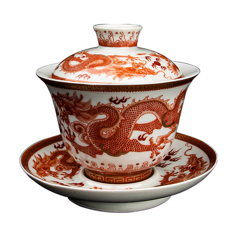 Retro Alum Red Ceramic Cover Bowl-Double Fengfu Antique Alum Red Ceramic Lid Bowl-Double Dragon