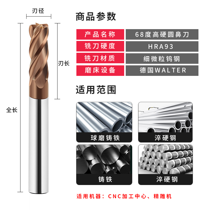 68 degree tungsten steel round nose milling cutter 4 blades quenched die steel universal milling cutter heat treatment processing high hard arc milling cutter