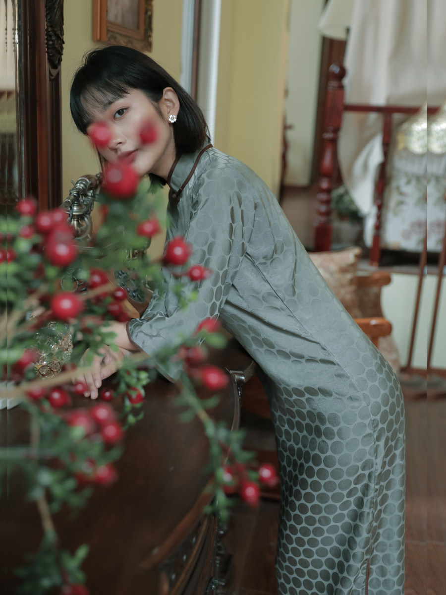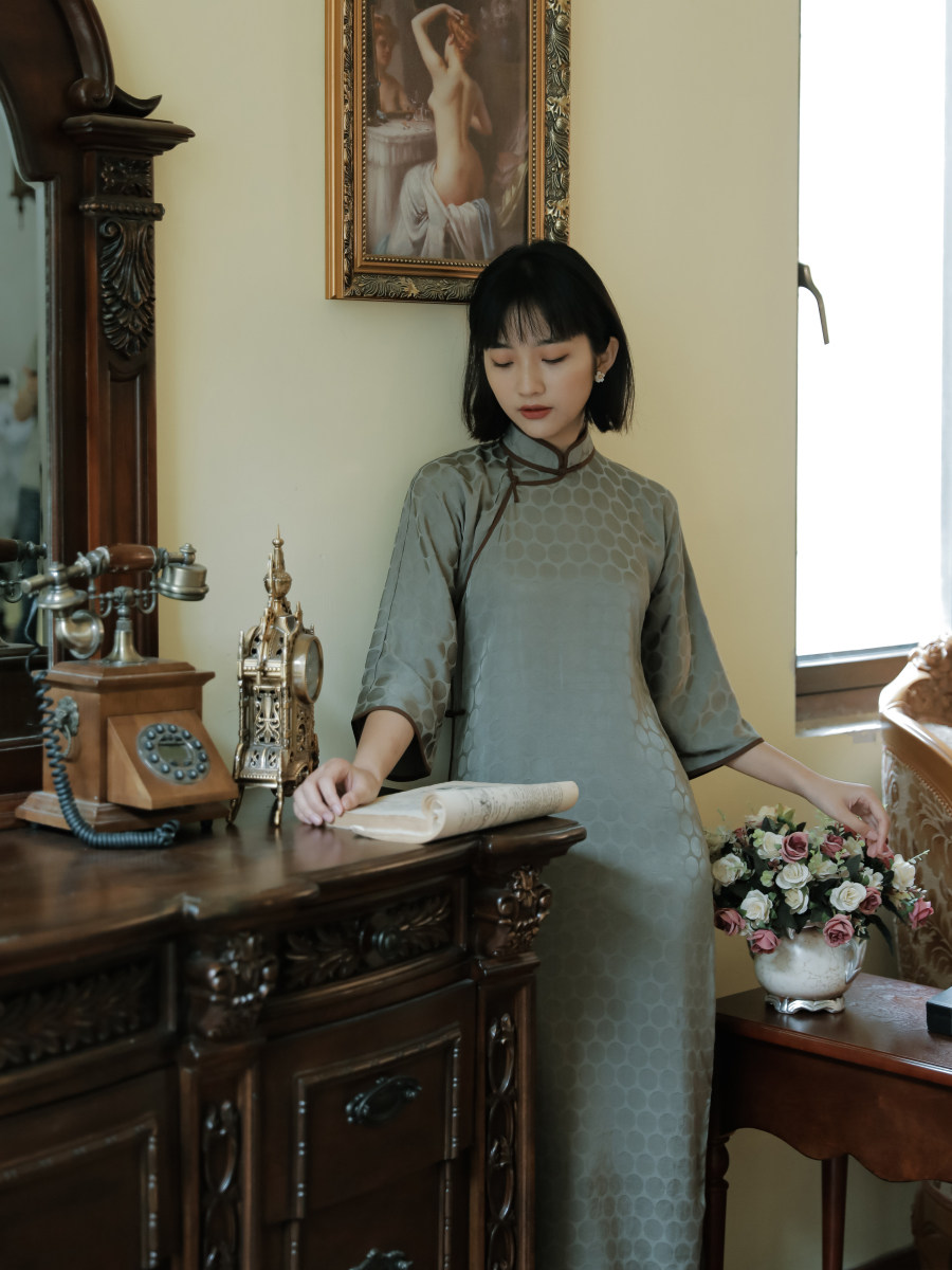 Momo cheongsam spring and autumn six-point wide sleeves without provinces and full cardigan mid-length vintage jacquard rayon cheongsam Qingjuan