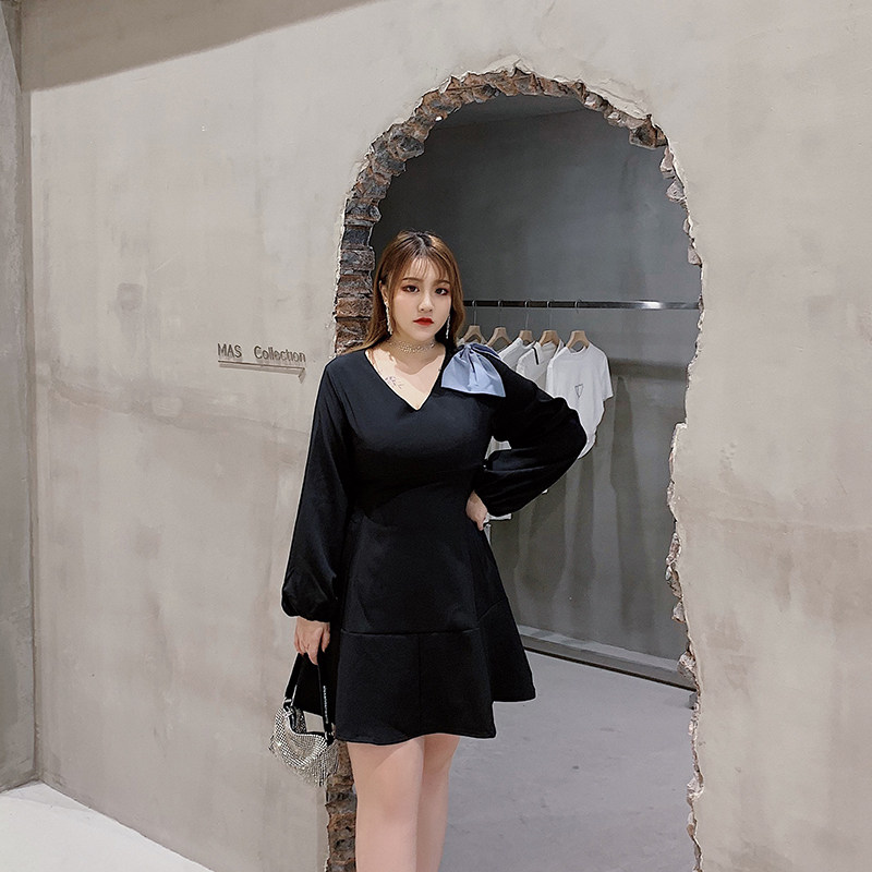 Xitonger large size women's clothing fat mm autumn waist slim V-neck bow dress cover belly all-match little black dress