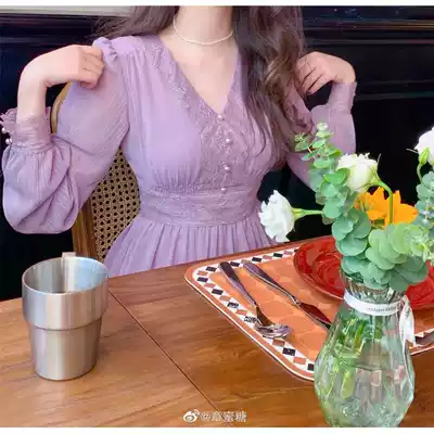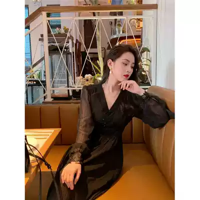 Bring your own soft light gentle sweet temperament fairy romantic V collar lace stitching long sleeve dress women 2021 early autumn