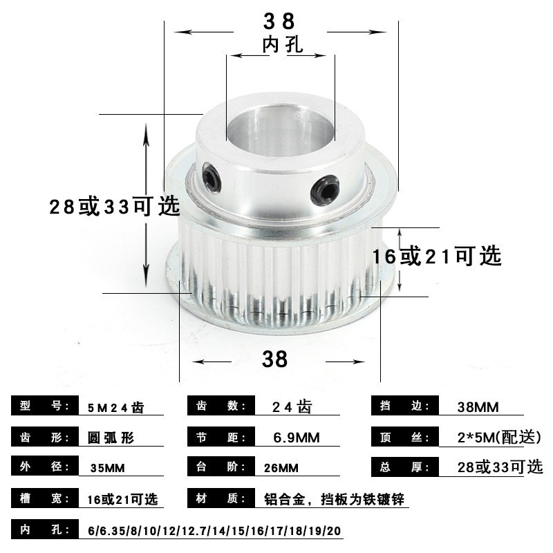 5M synchronous wheel 24 tooth socket width 16 inner hole 6-20 convex step BF type motor transmission synchronous belt aluminium alloy