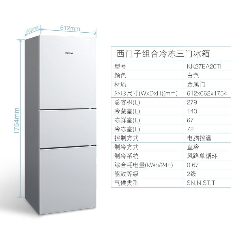 Siemens official small refrigerator household 279L fresh storage frozen ultra-thin three-door KK27EA20TI